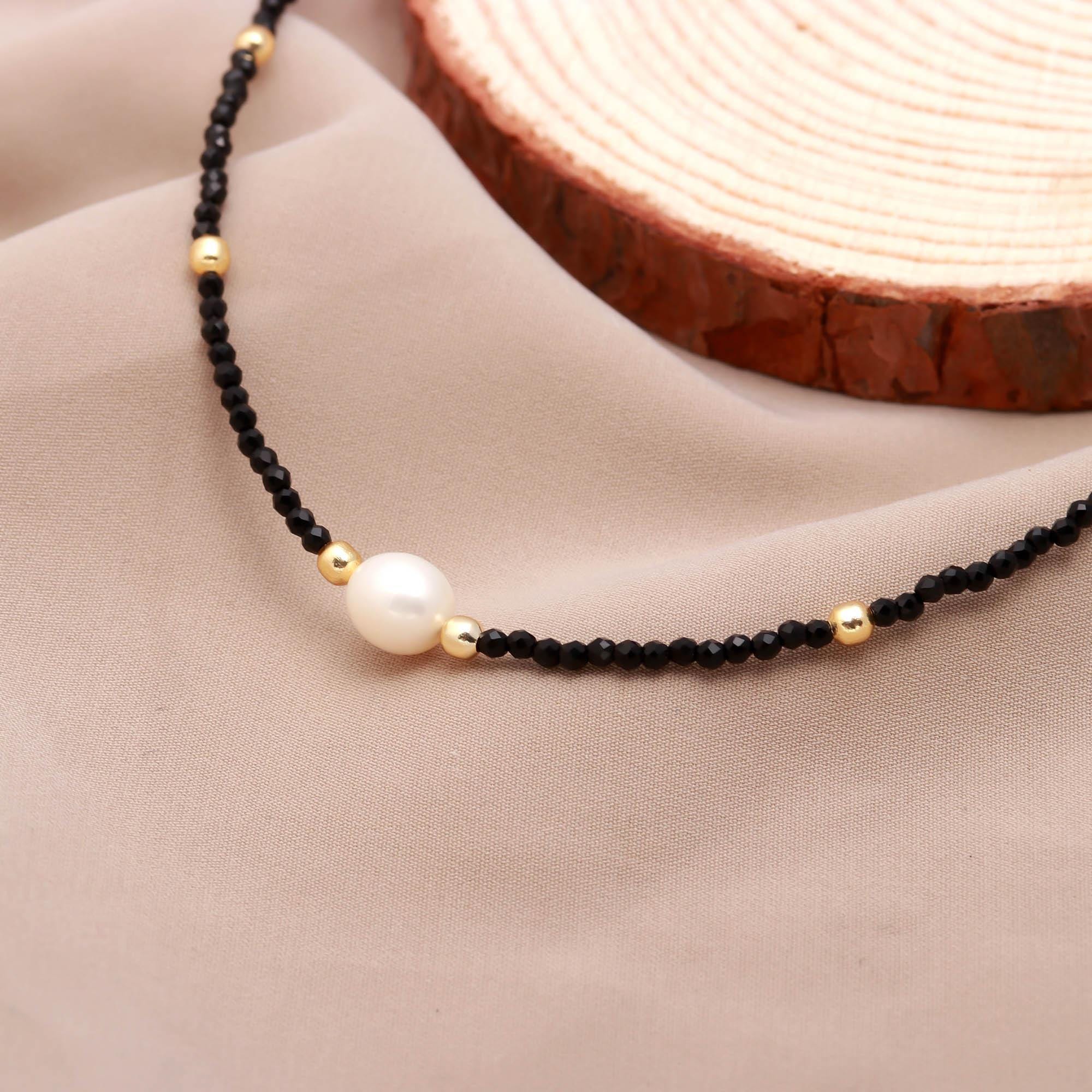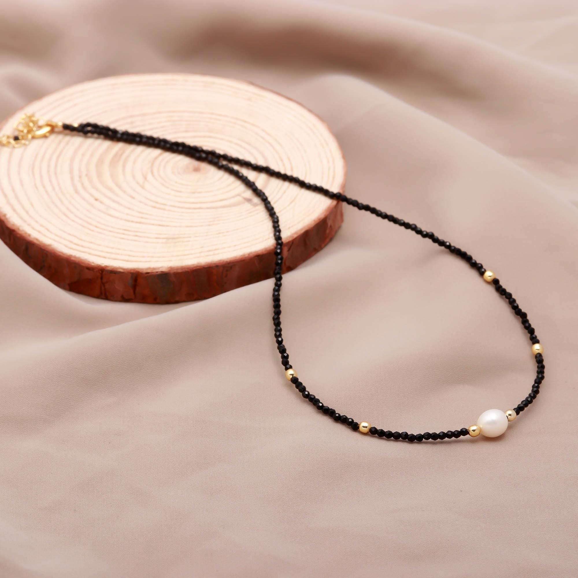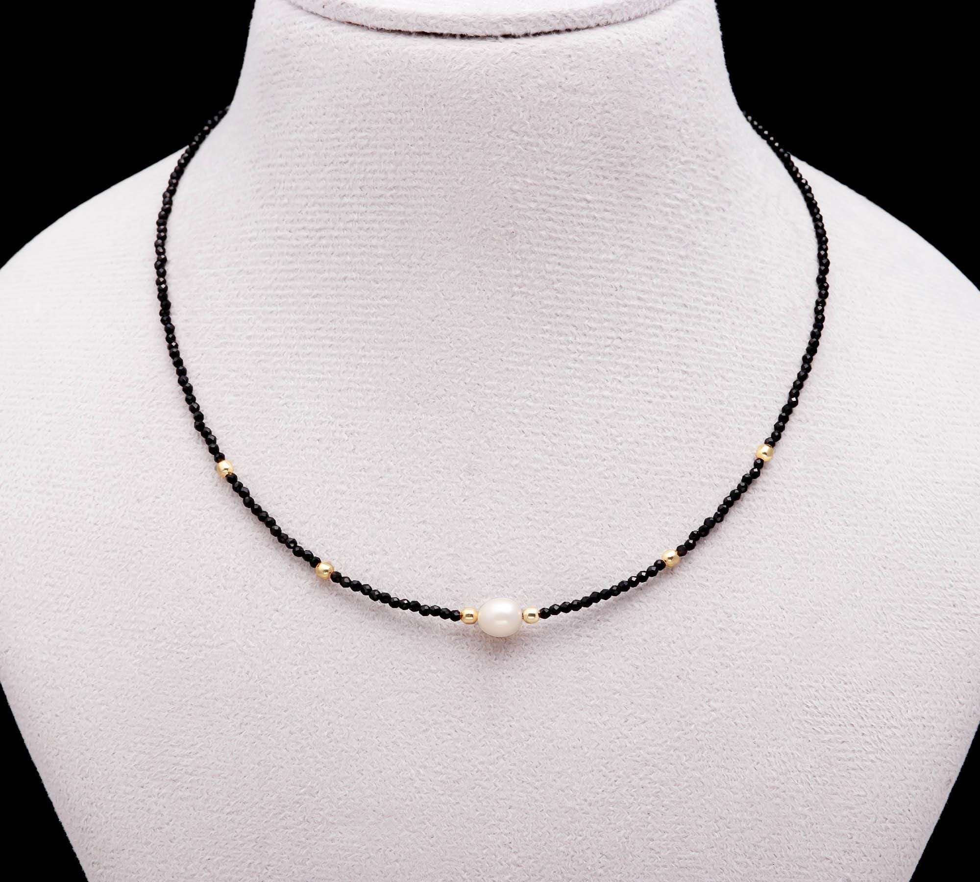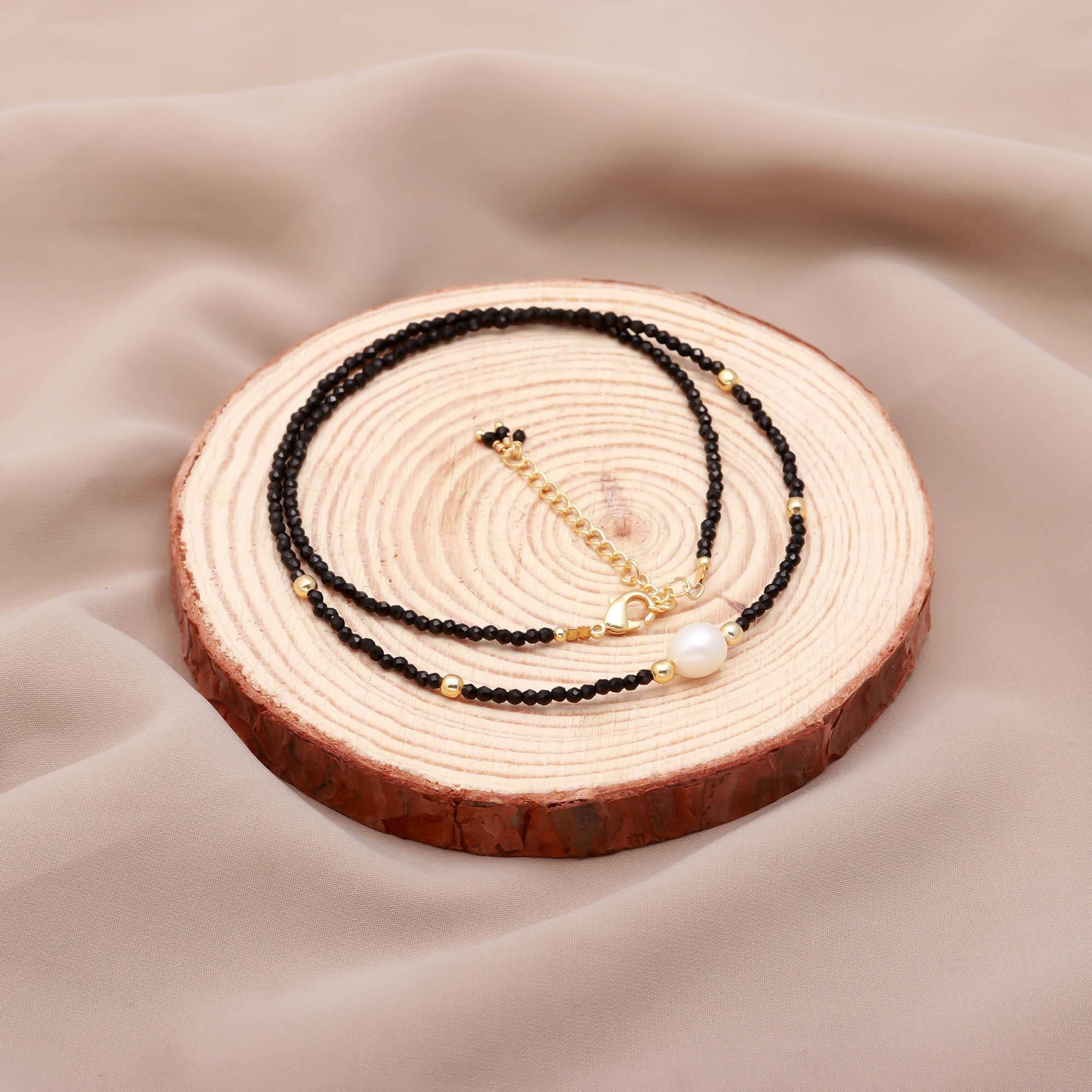 Artisan Craftsmanship & Materials Gemstone size: 2.2–2.5 mm faceted black spinel beads, genuine cultured pearl Metal: 18k gold-plated brass, nickel-free & lead-free Chain length: 16 + 2 inch adjustable, lobster clasp Technique: Hand-beaded with secure finishing