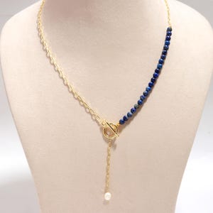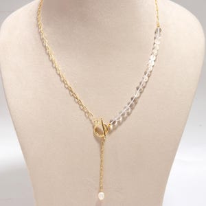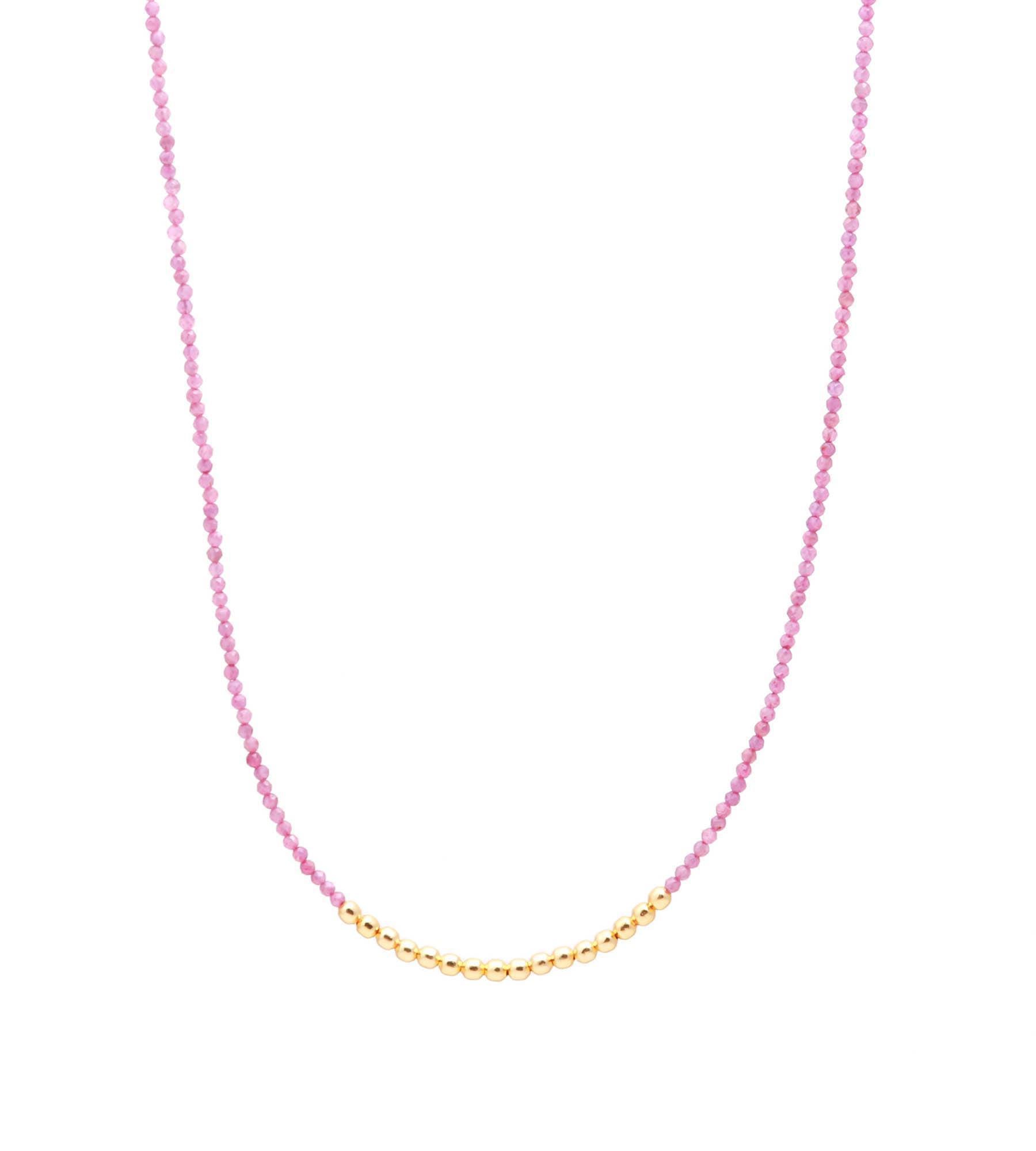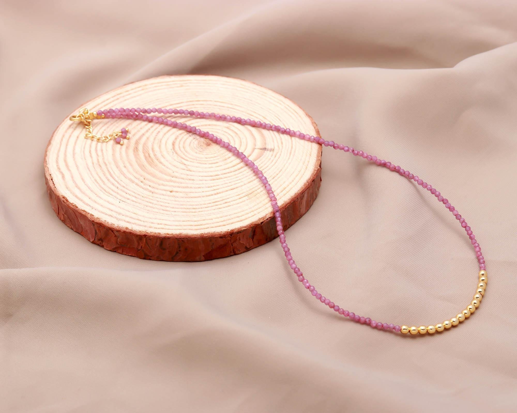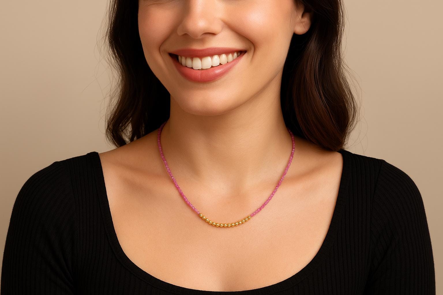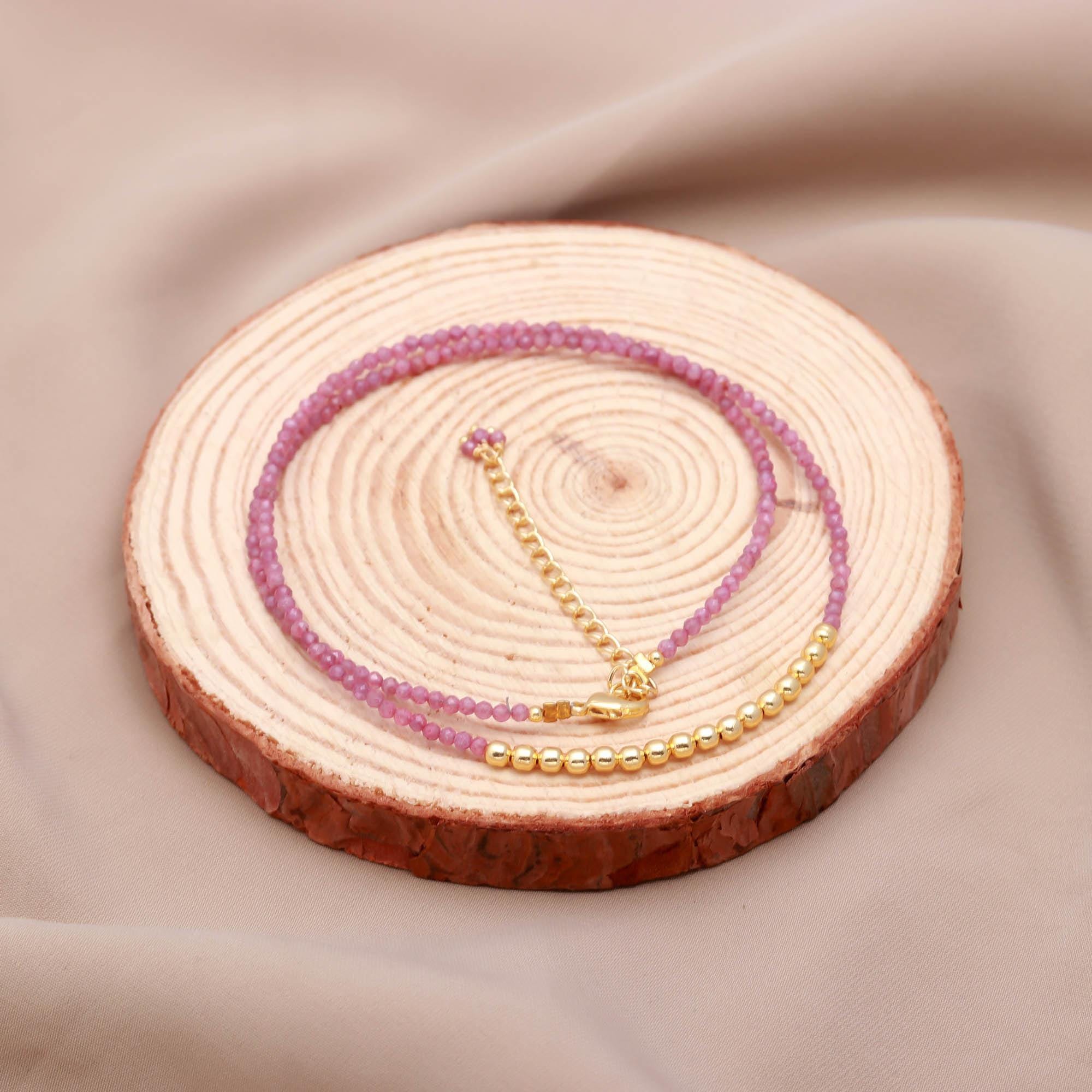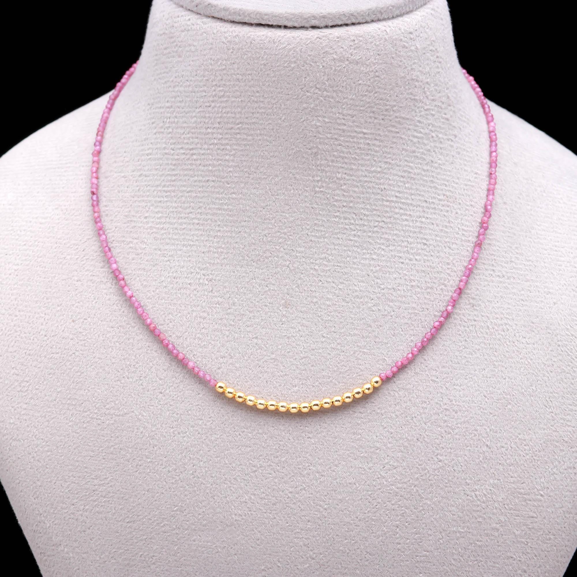 The necklace features 2.2–2.5 mm faceted pink tourmaline beads known for their emotional healing, self-love, and heart chakra balancing properties, complemented by smooth 3 mm brass ball accents that add a chic, contemporary touch.