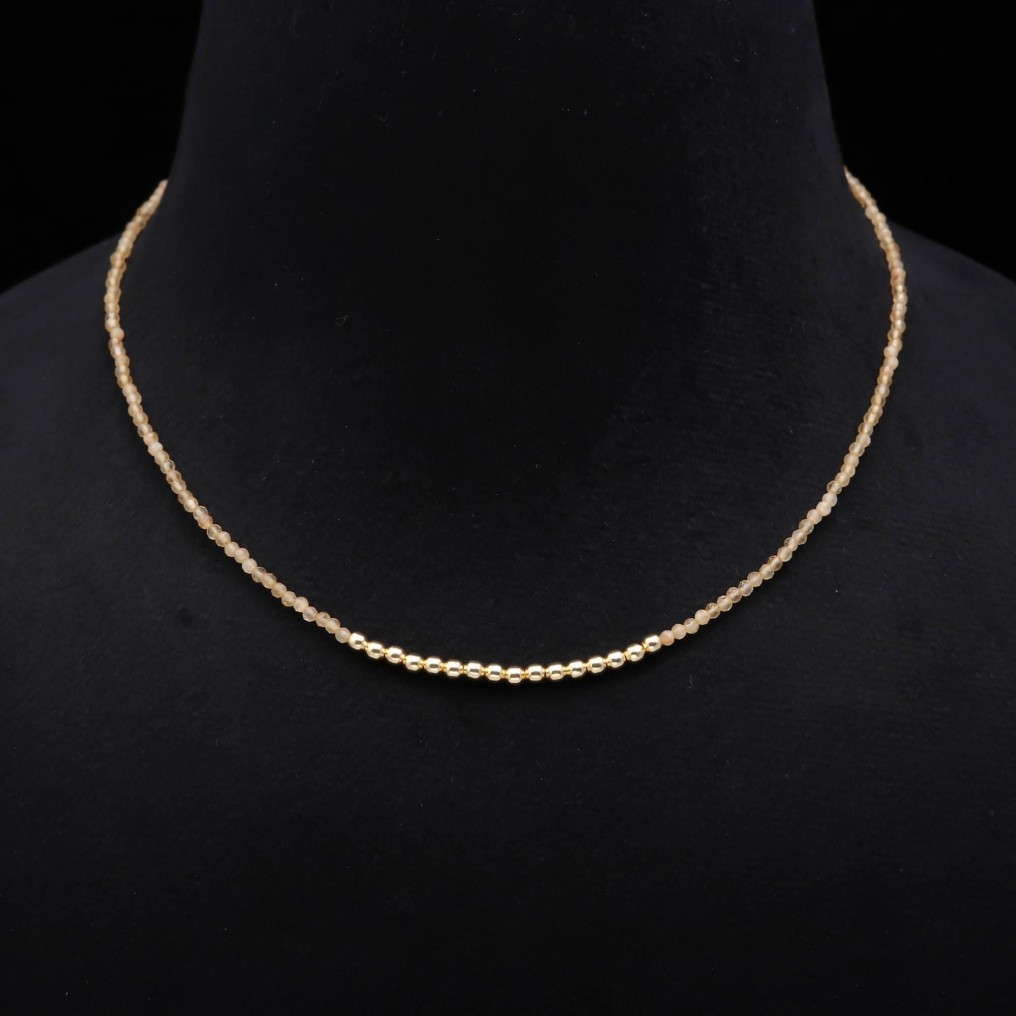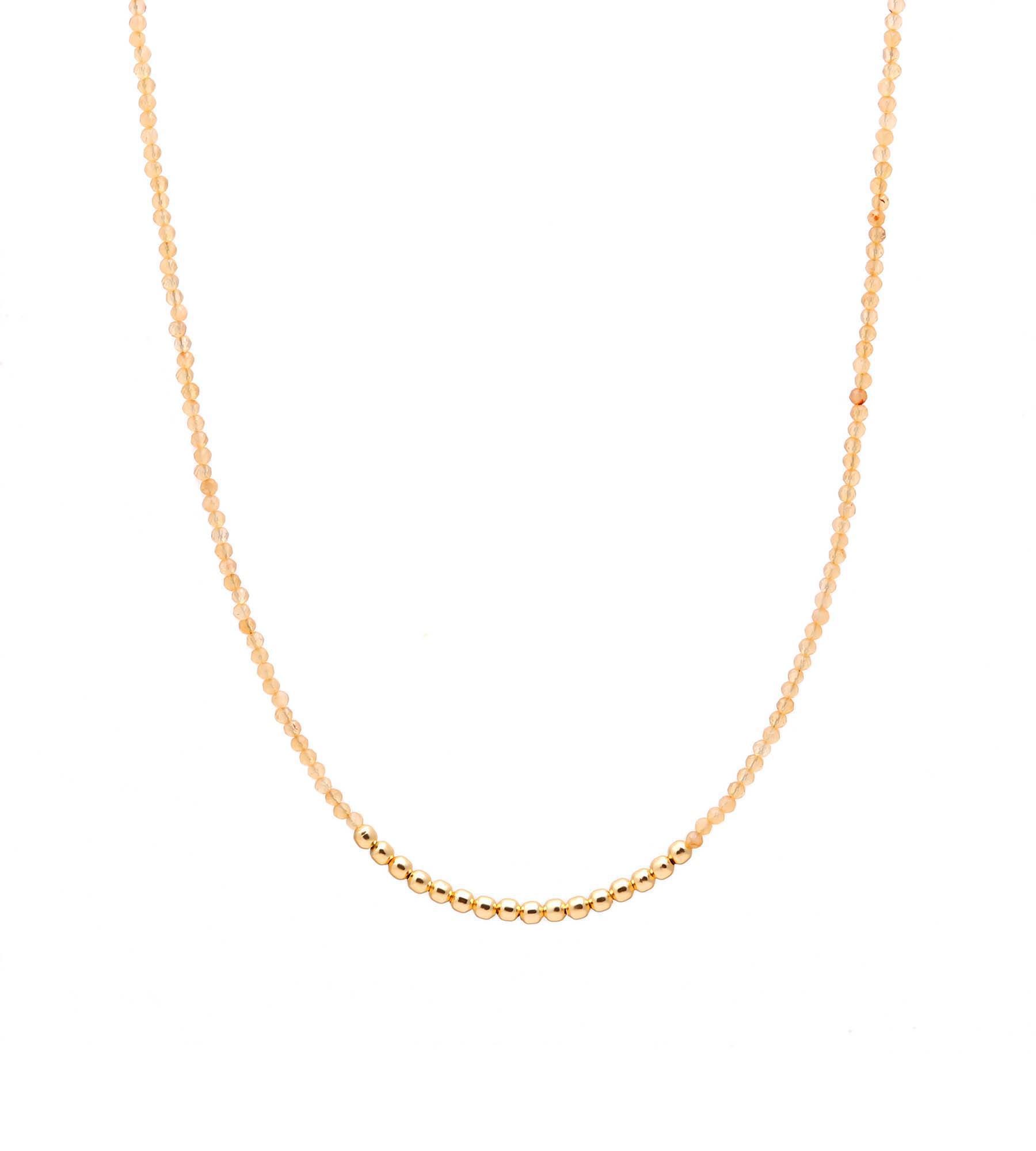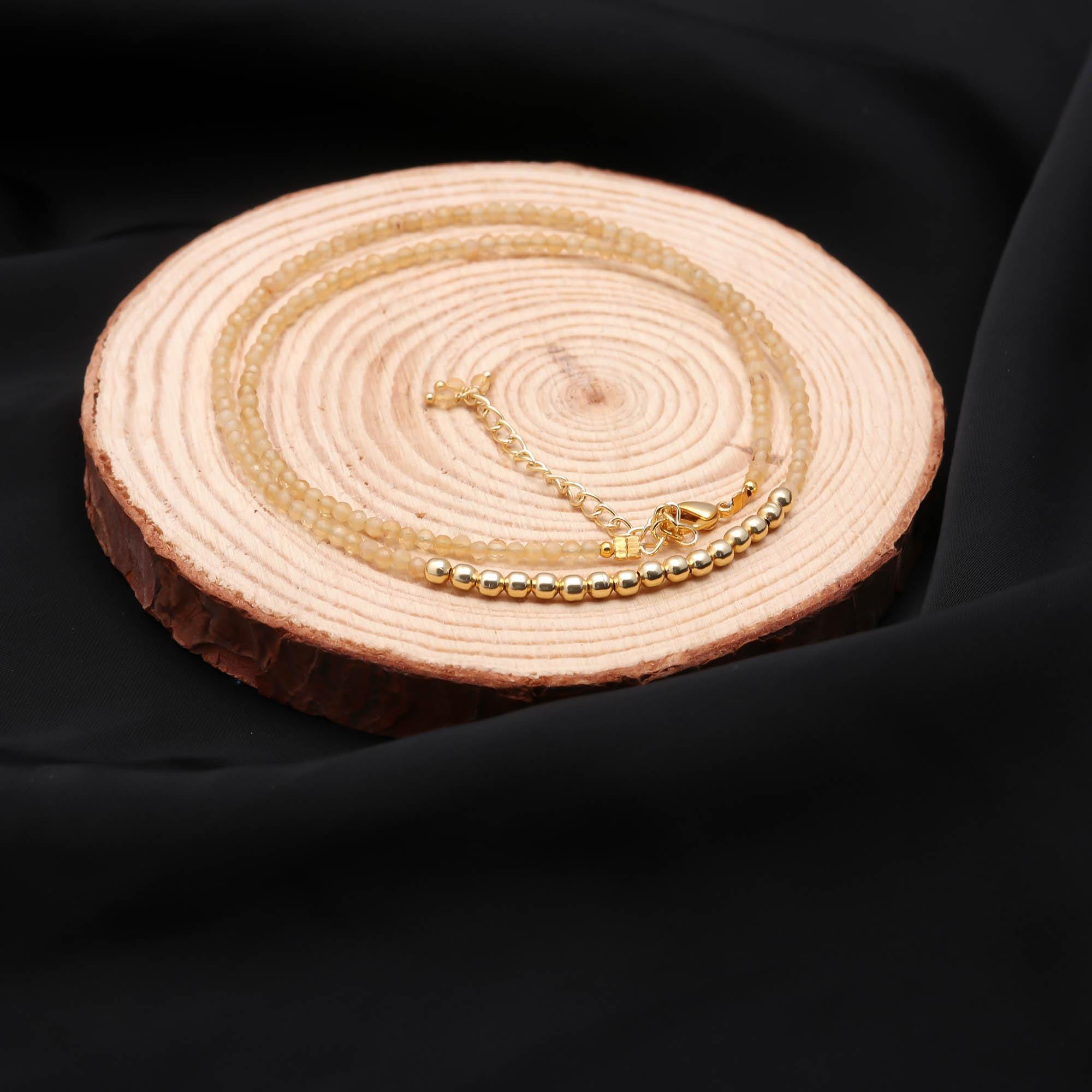 The necklace features 2.2–2.5 mm faceted citrine beads known for their vibrant positivity, abundance attraction, and creative empowerment, complemented by smooth 3 mm brass ball accents that add a chic, contemporary touch.