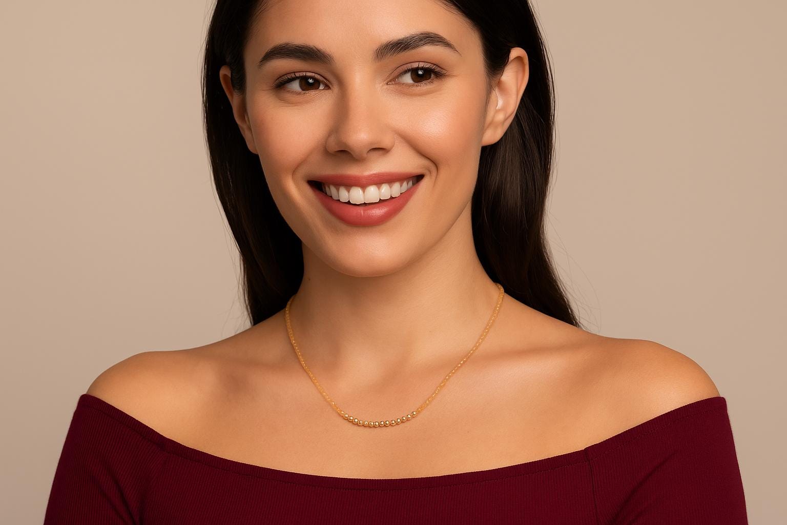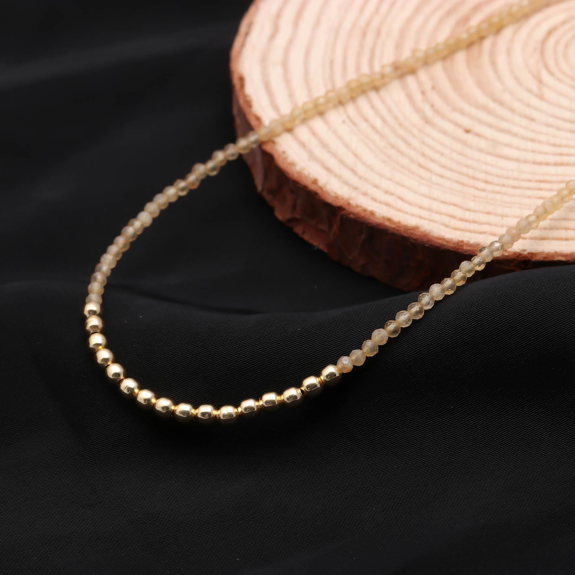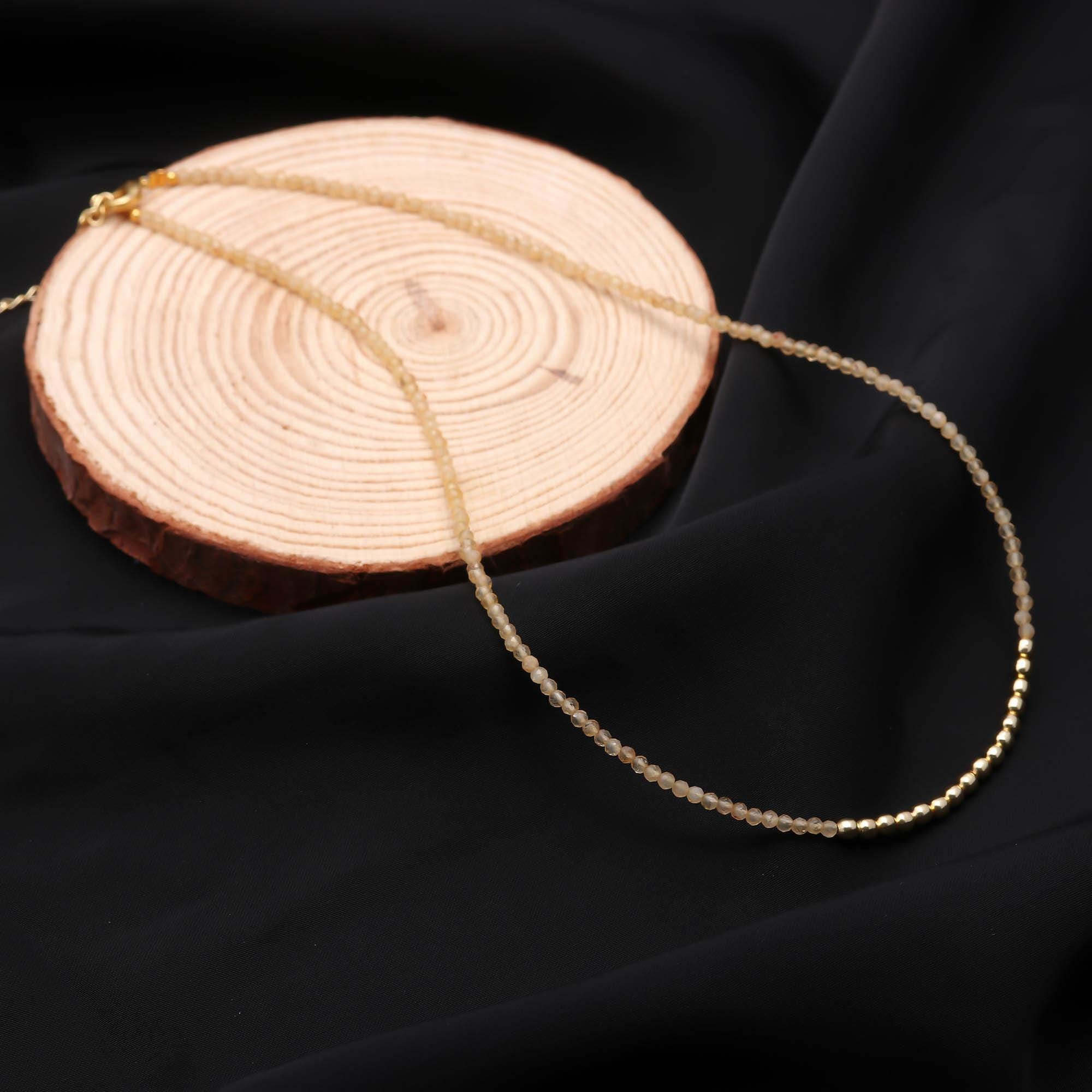 The necklace features 2.2–2.5 mm faceted citrine beads known for their vibrant positivity, abundance attraction, and creative empowerment, complemented by smooth 3 mm brass ball accents that add a chic, contemporary touch.
