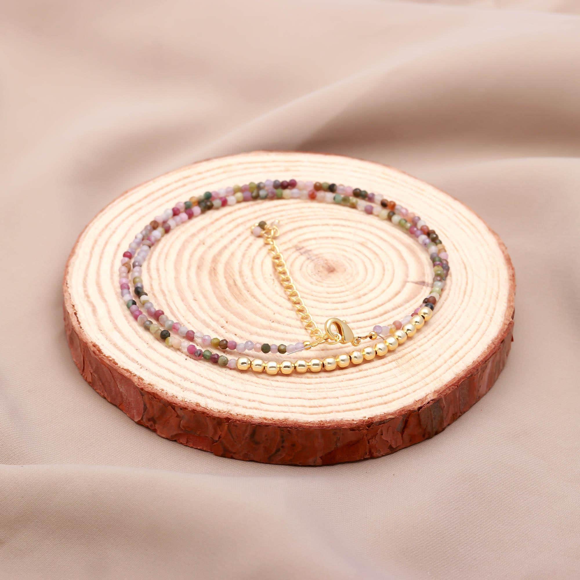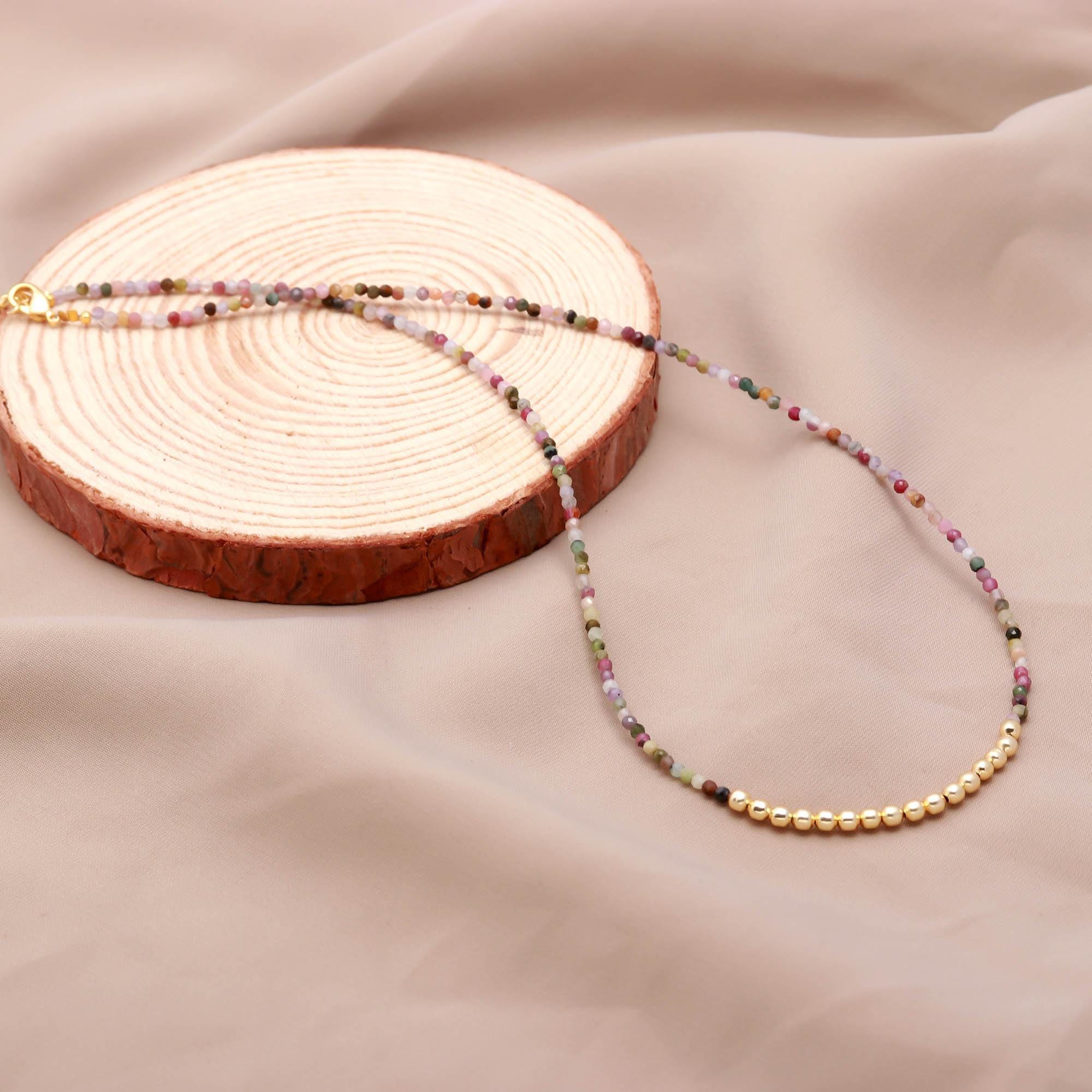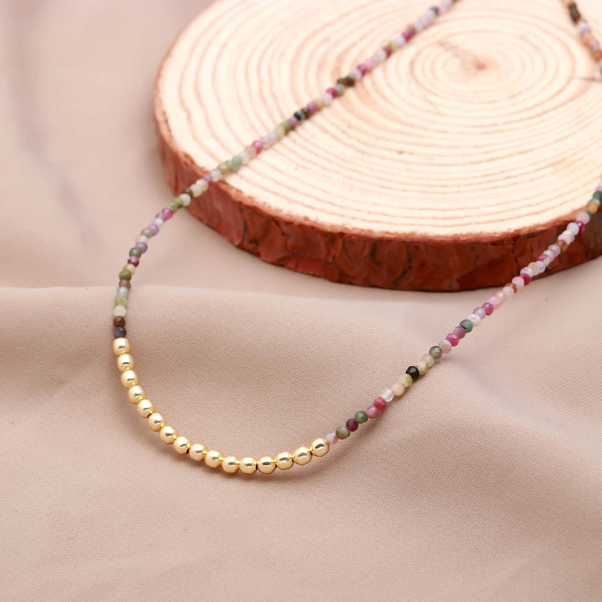 The necklace features 2.2–2.5 mm faceted multi tourmaline beads known for their energy balancing, emotional healing, protection, and creativity enhancement, complemented by smooth 3 mm brass ball accents that add a chic, contemporary touch.