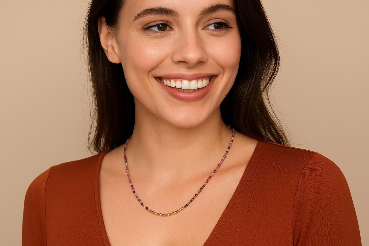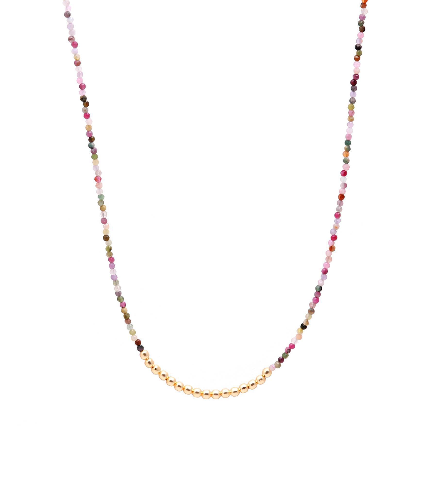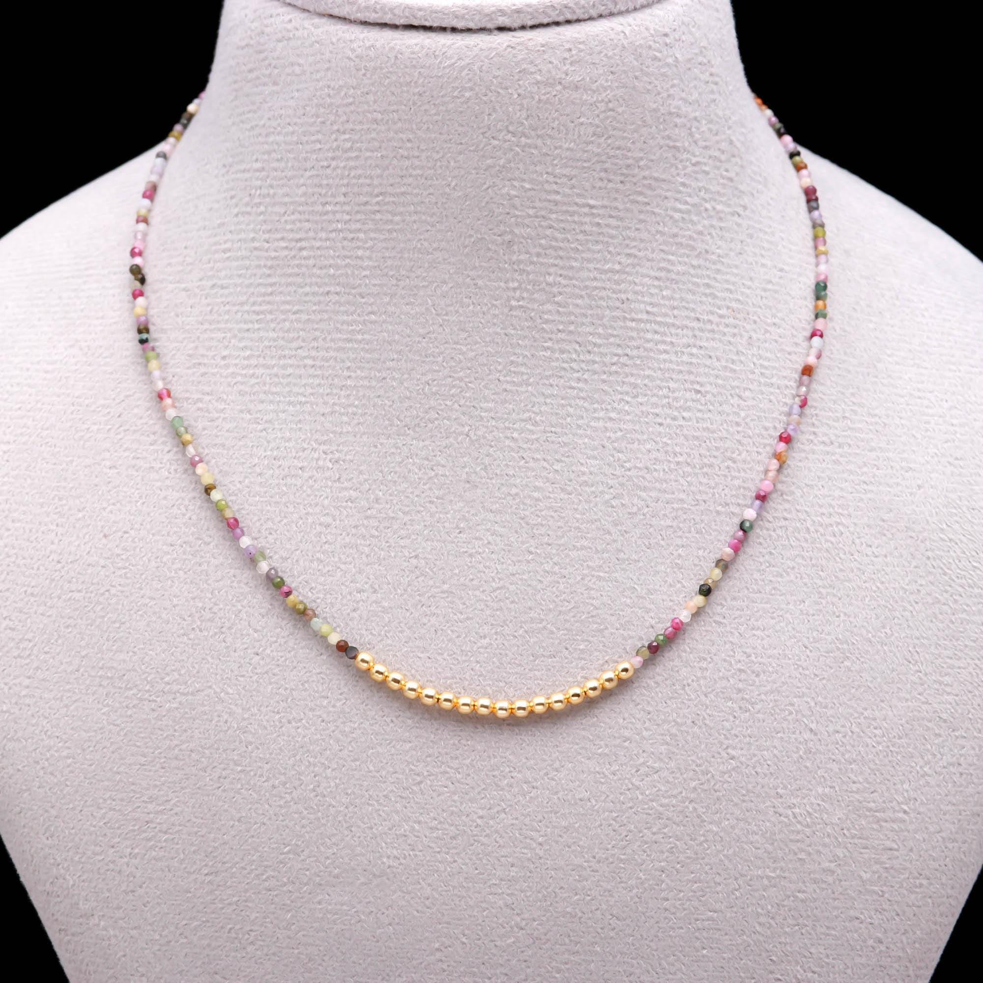 The necklace features 2.2–2.5 mm faceted multi tourmaline beads known for their energy balancing, emotional healing, protection, and creativity enhancement, complemented by smooth 3 mm brass ball accents that add a chic, contemporary touch.