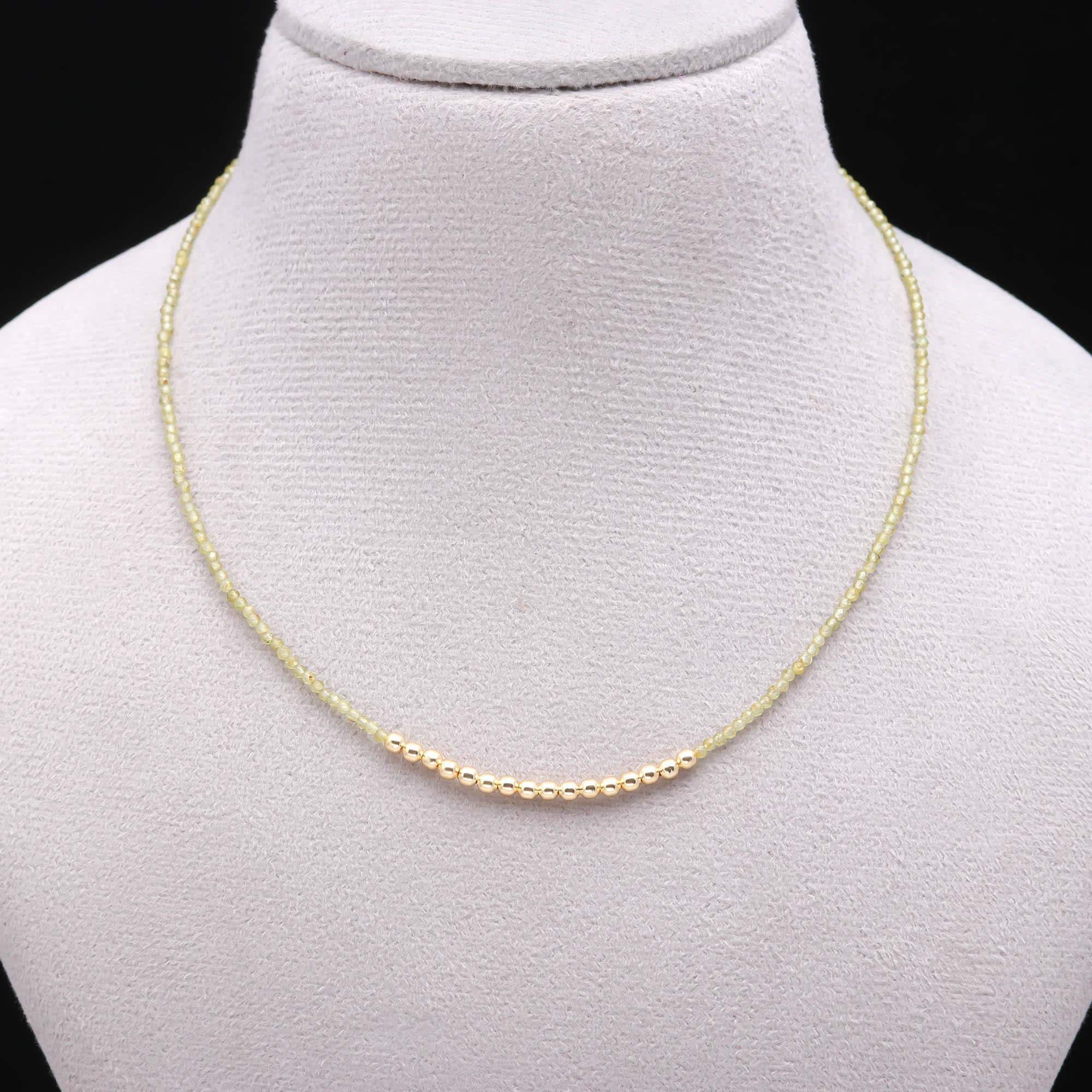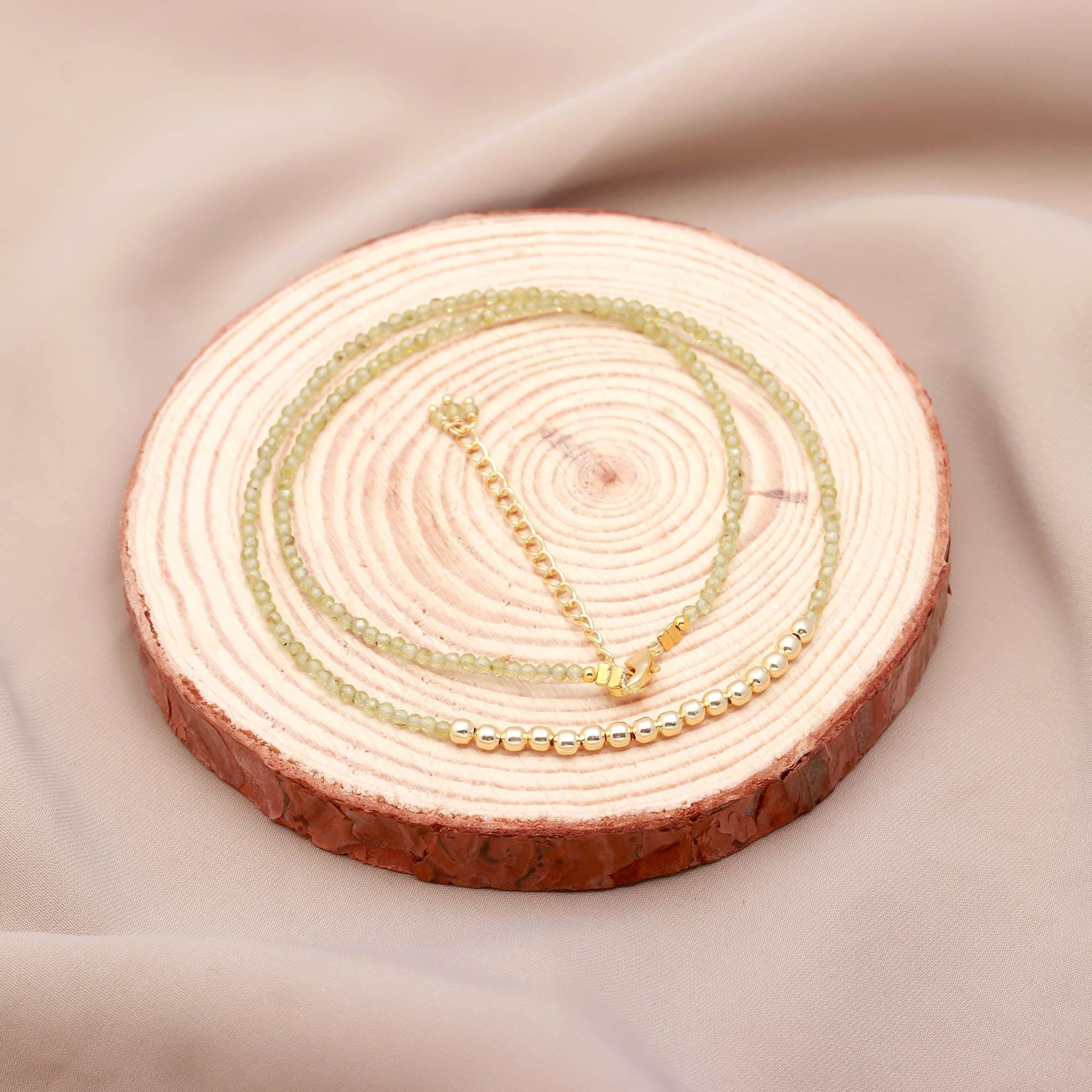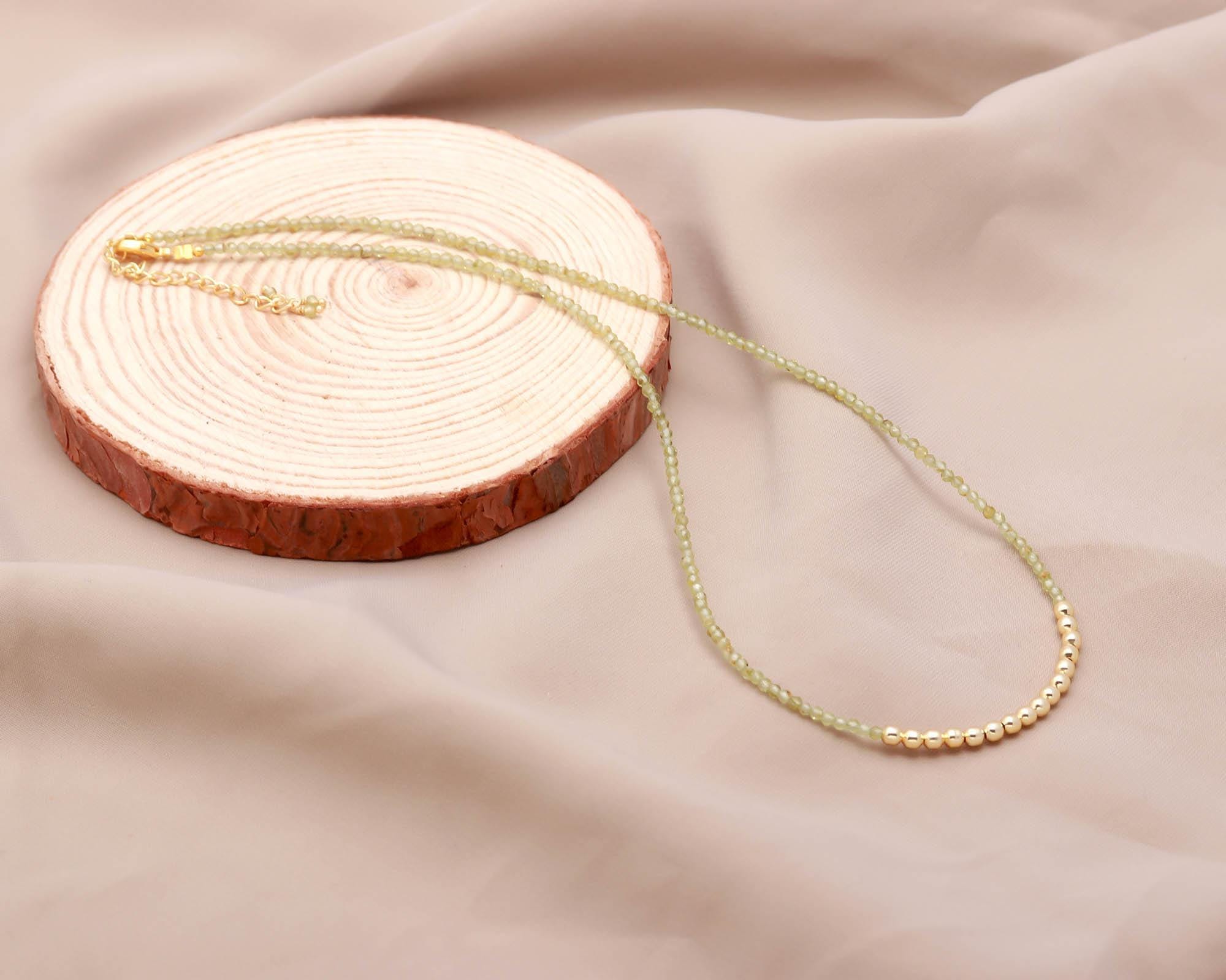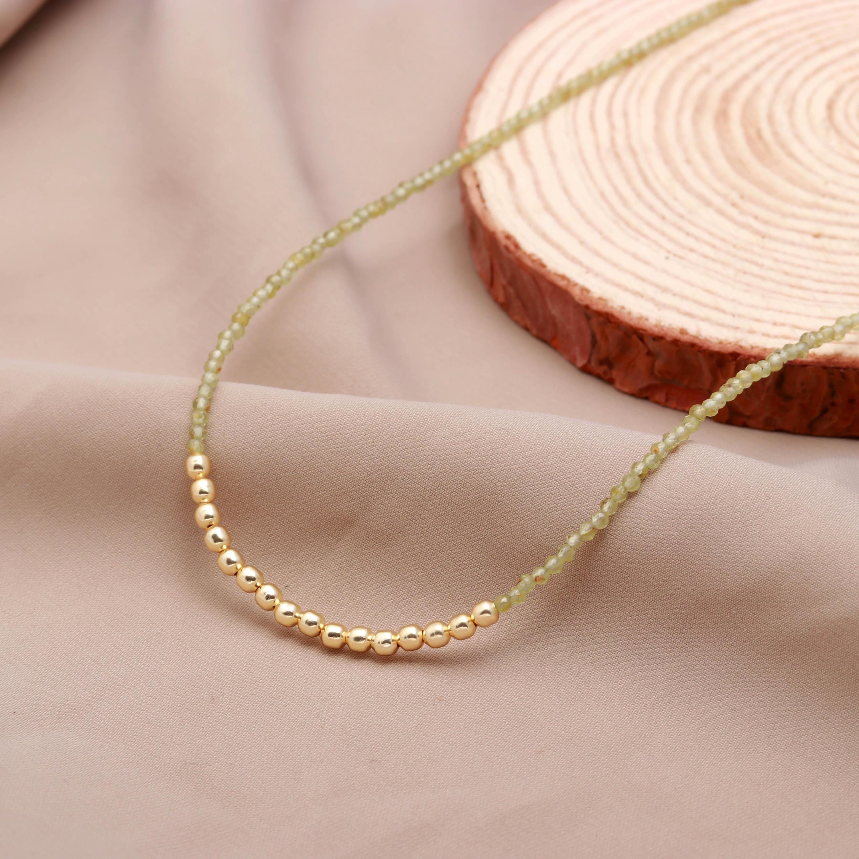 The necklace features 2.2–2.5 mm faceted peridot beads known for their vibrant healing properties, emotional balance, prosperity attraction, and protection, complemented by smooth 3 mm brass ball accents that add a chic, contemporary touch.