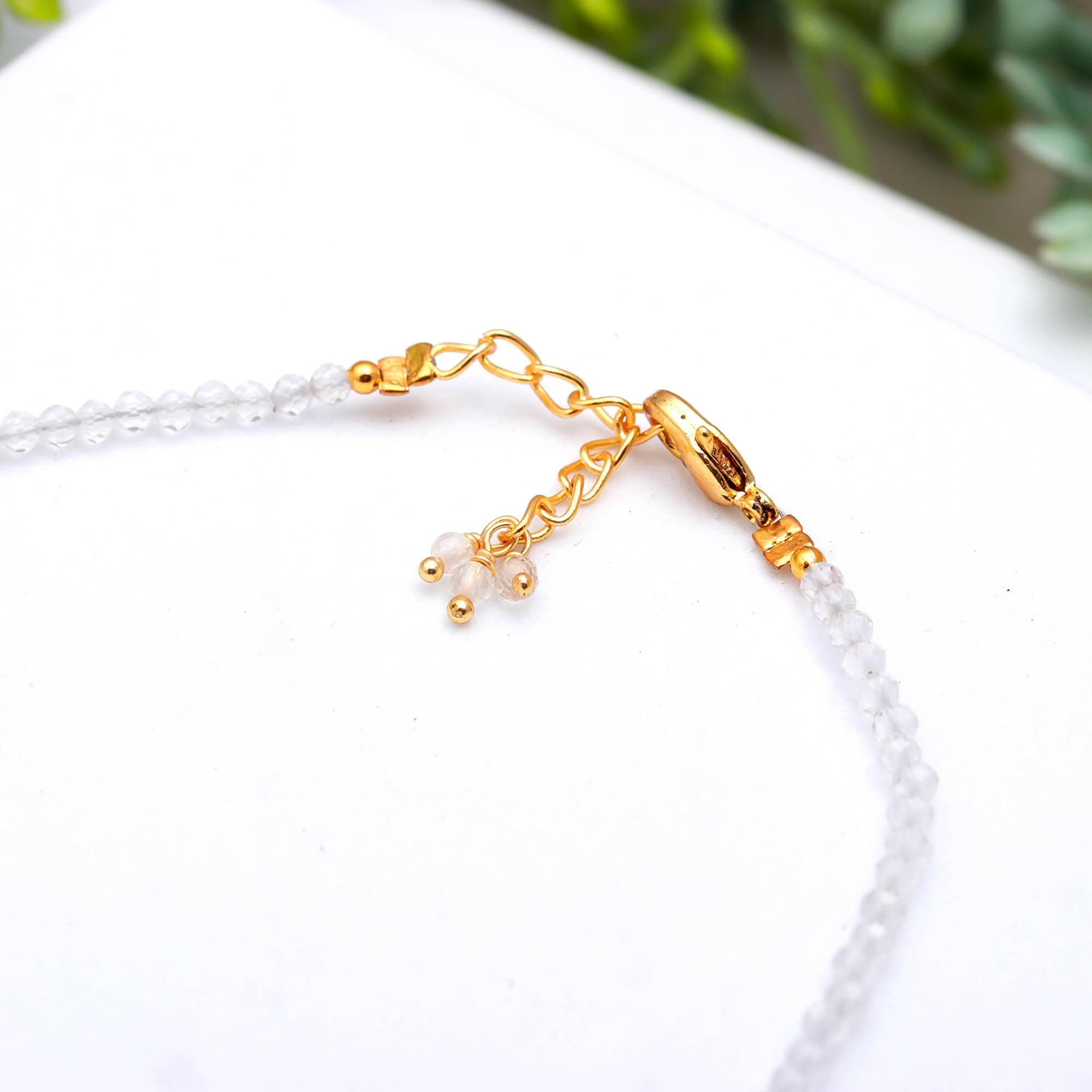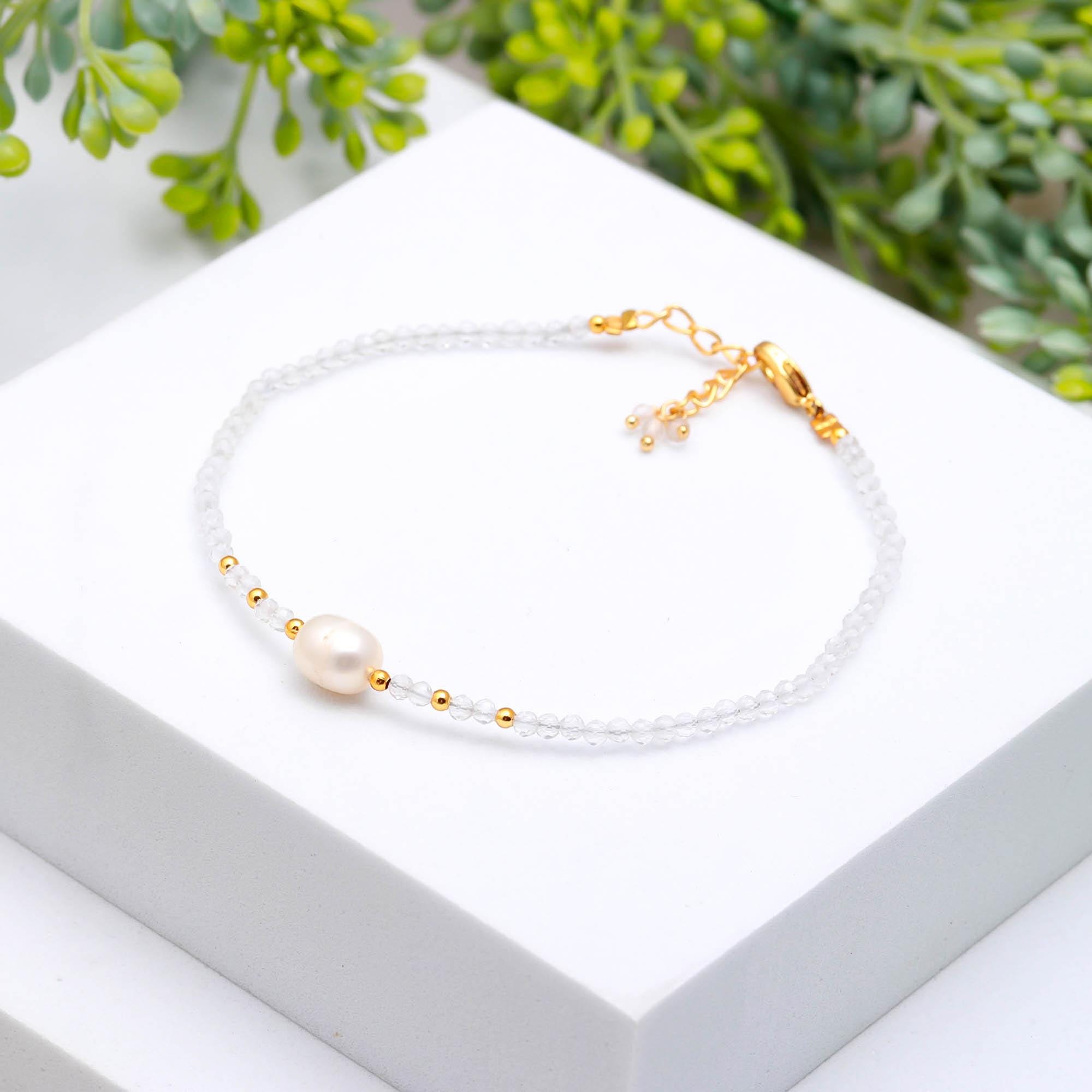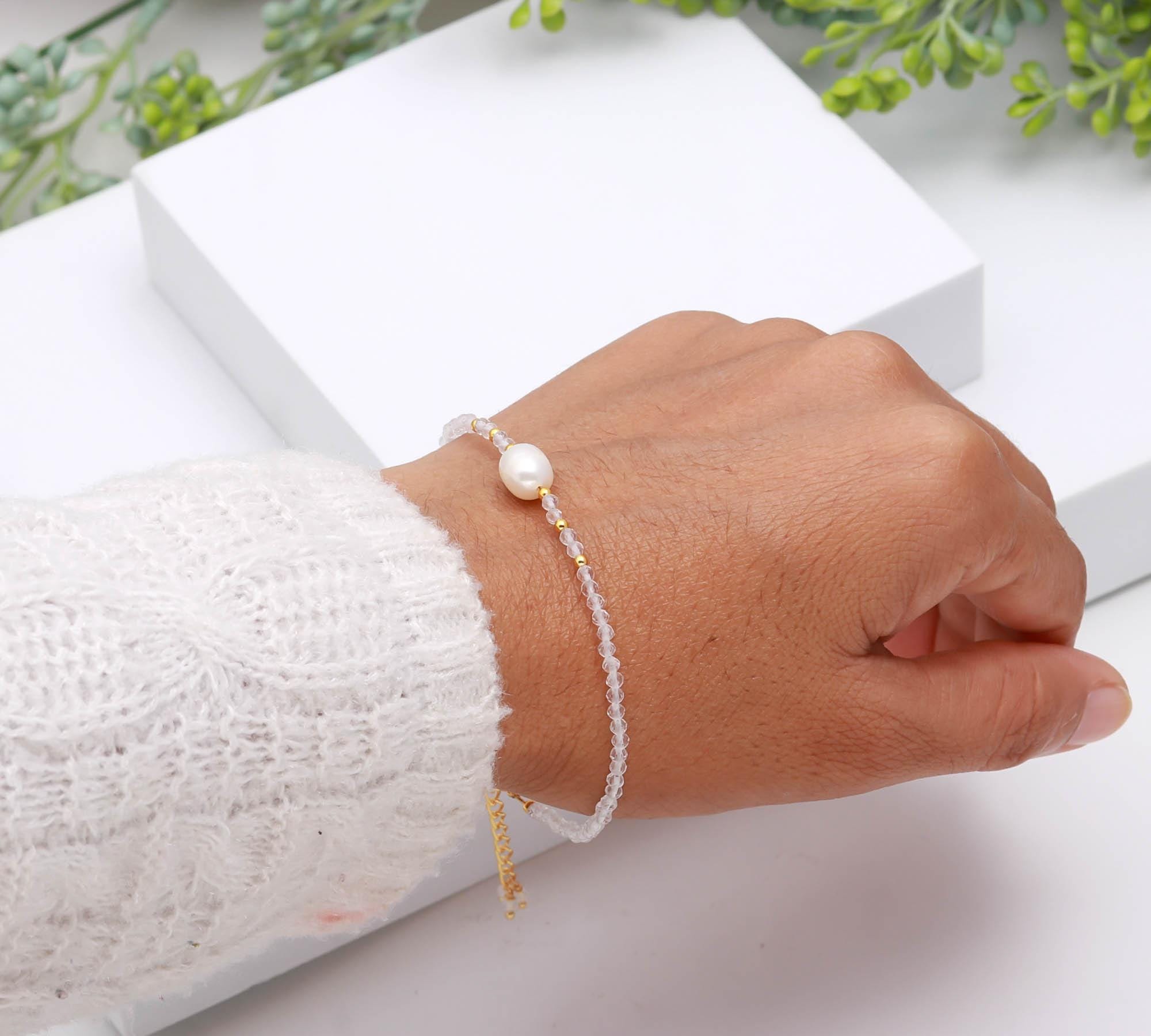 Gemstone size: 2.2–2.5 mm faceted clear quartz beads Accent size: 2 mm polished brass balls Centerpiece: Genuine freshwater pearl Metal: 18k gold plated brass Length: Adjustable 7 + 1 inch Technique: Hand-beaded, secure finishing