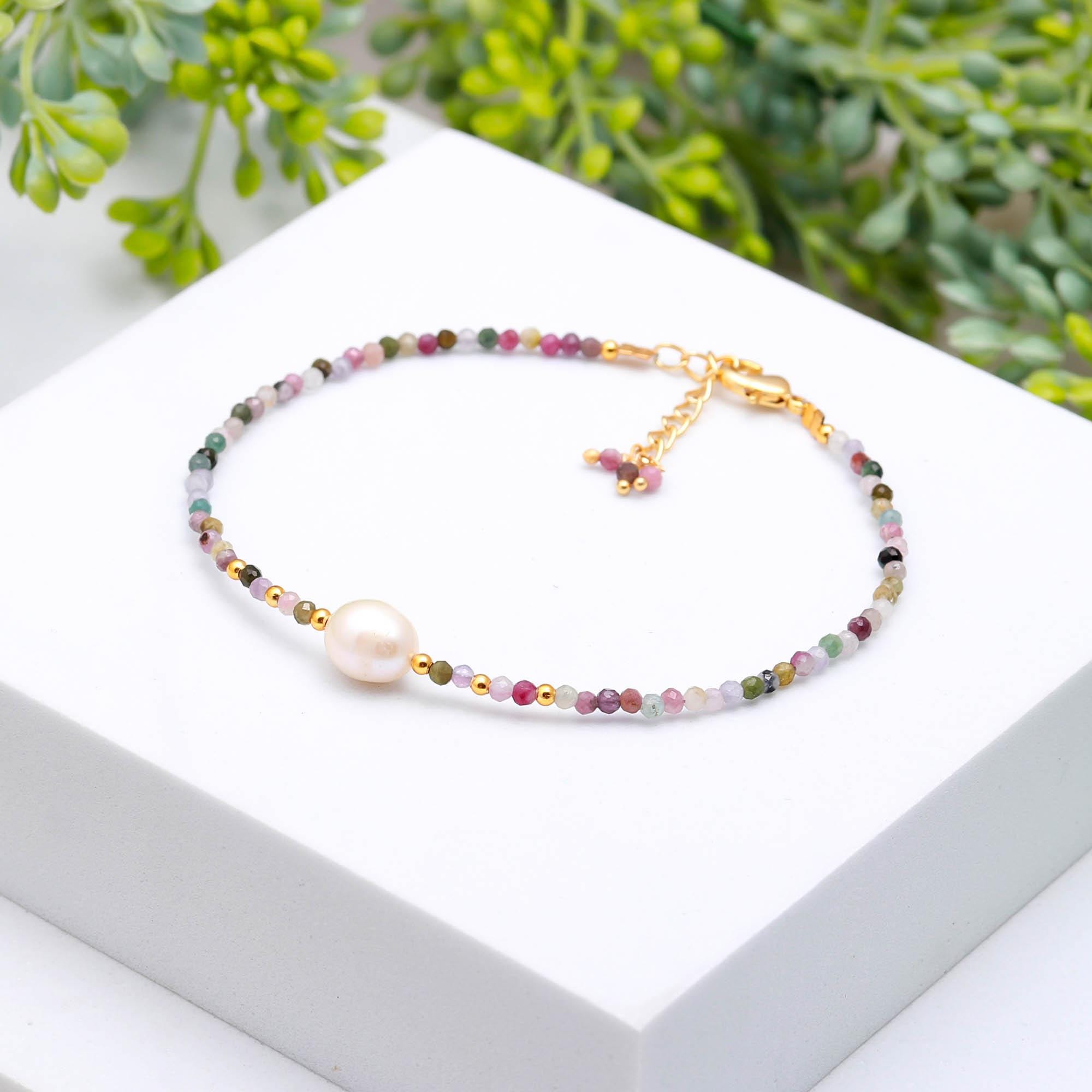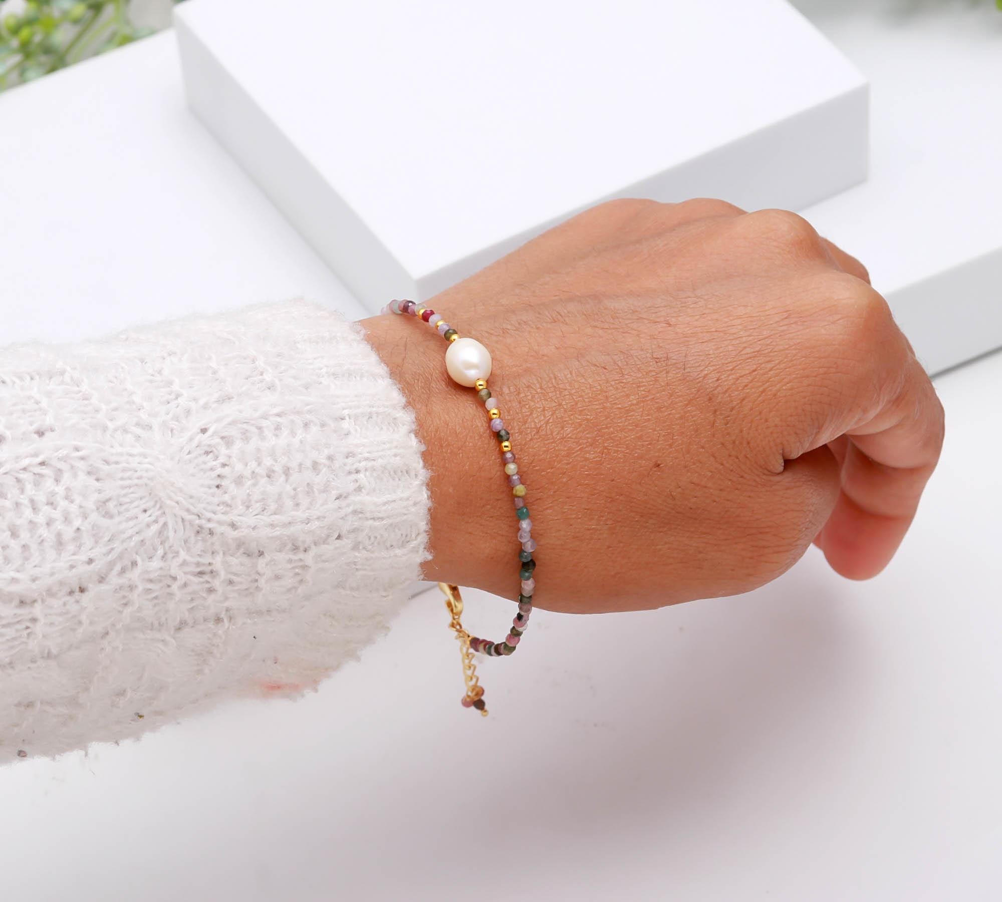 Gemstone size: 2.2–2.5 mm faceted multi tourmaline beads Accent size: 2 mm polished brass balls Centerpiece: Genuine freshwater pearl Metal: 18k gold plated brass Length: Adjustable 7 + 1 inch Technique: Hand-beaded, secure finishing