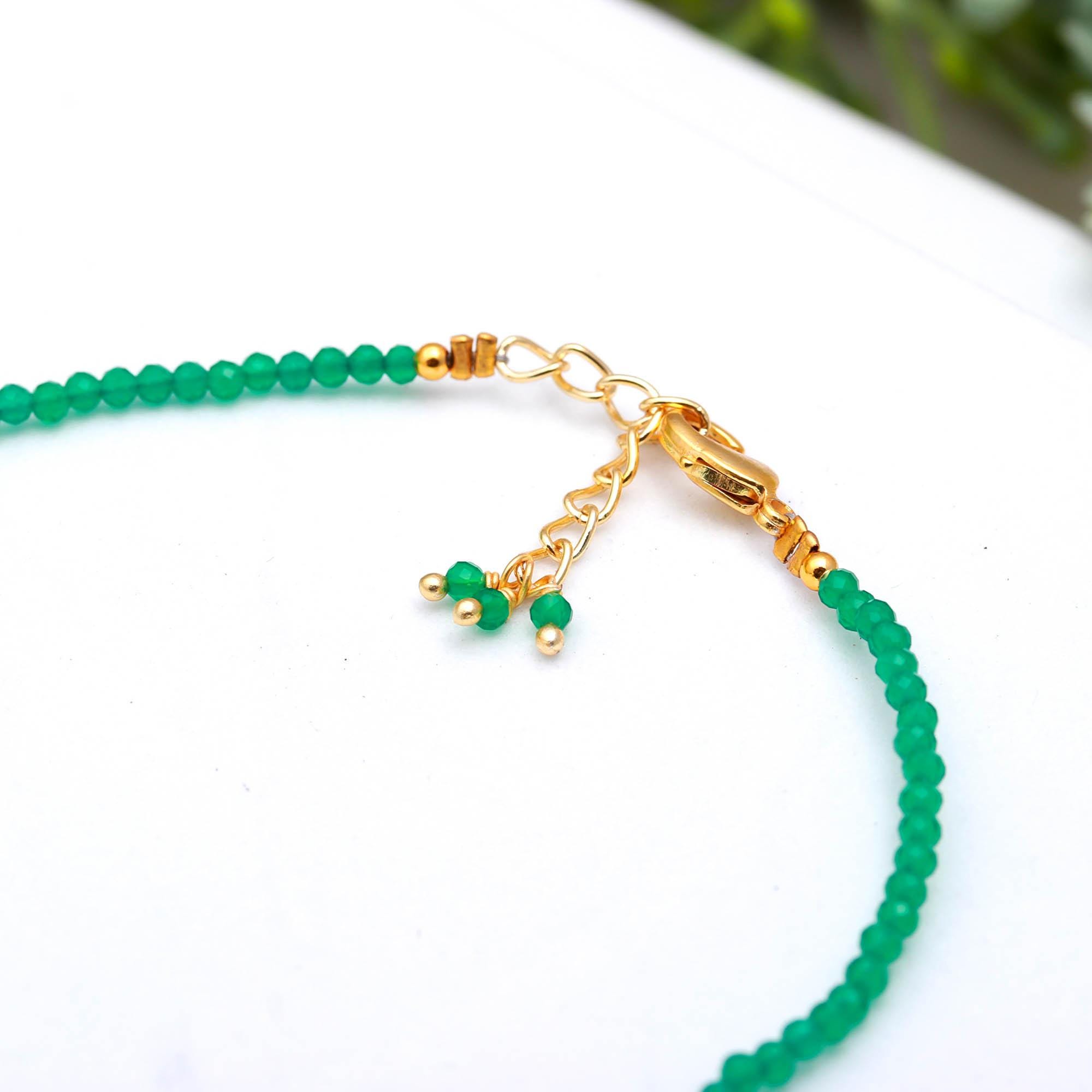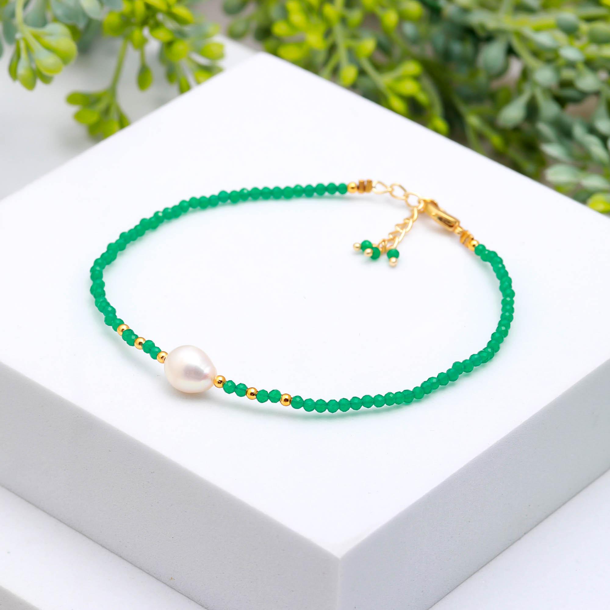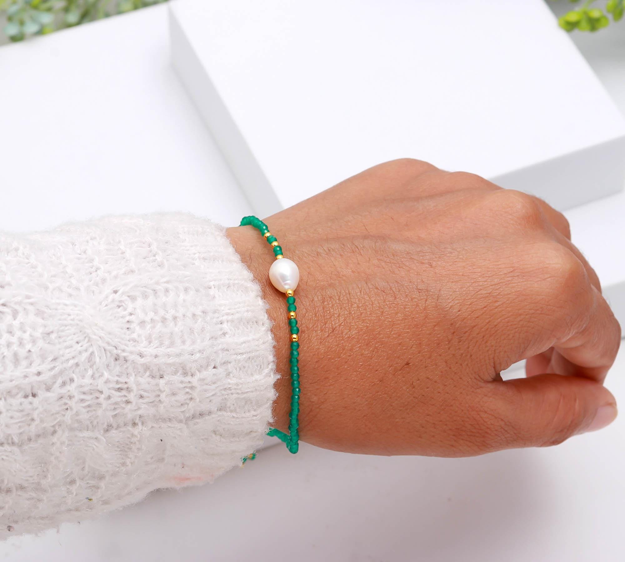 Gemstone size: 2.2–2.5 mm faceted green jade beads Accent size: 2 mm polished brass balls Centerpiece: Genuine freshwater pearl Metal: 18k gold plated brass Length: Adjustable 7 + 1 inch Technique: Hand-beaded, secure finishing