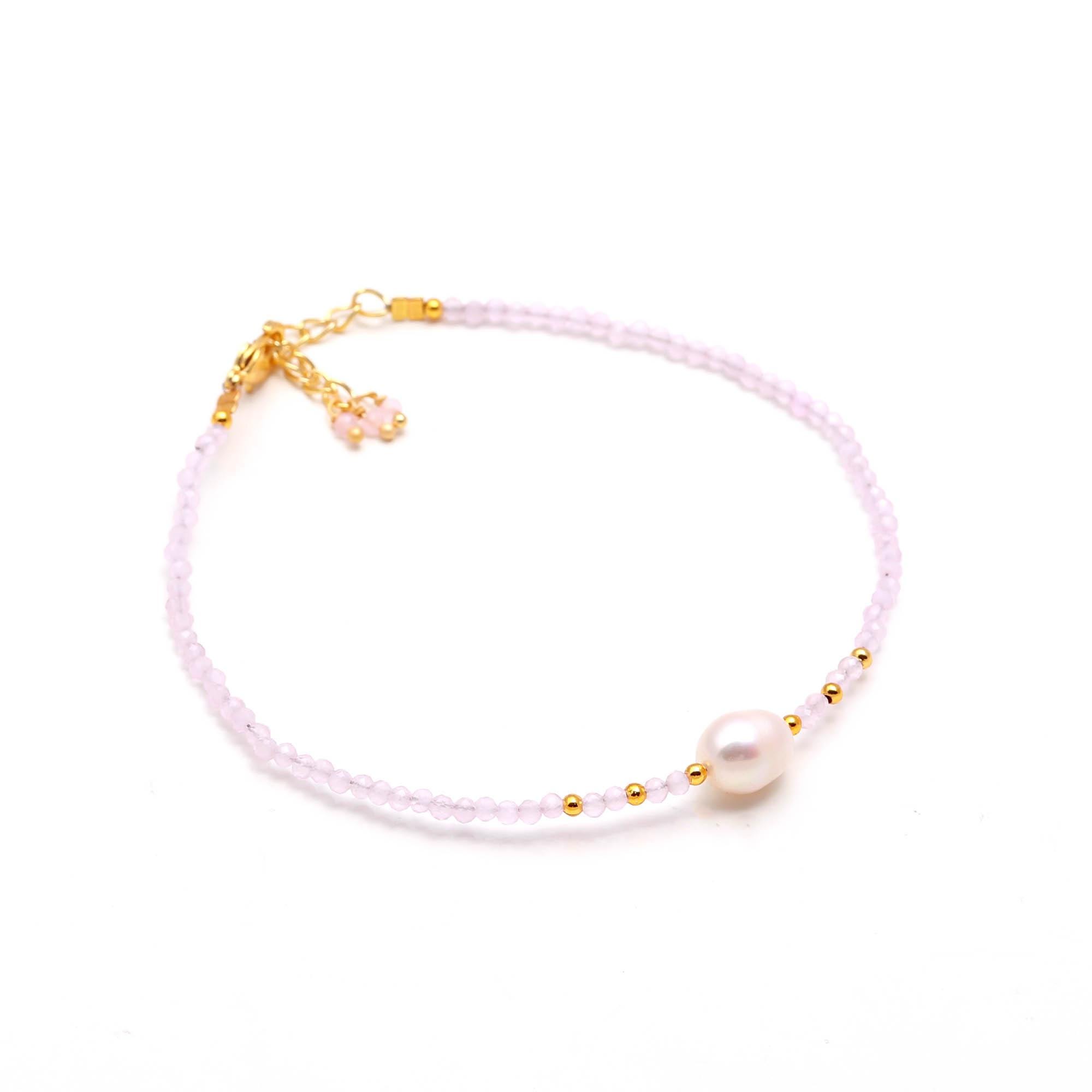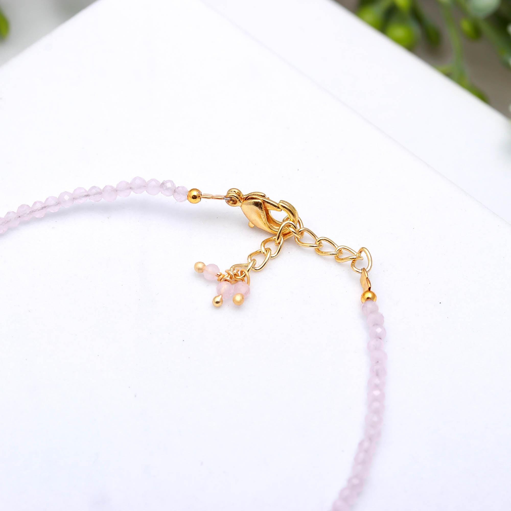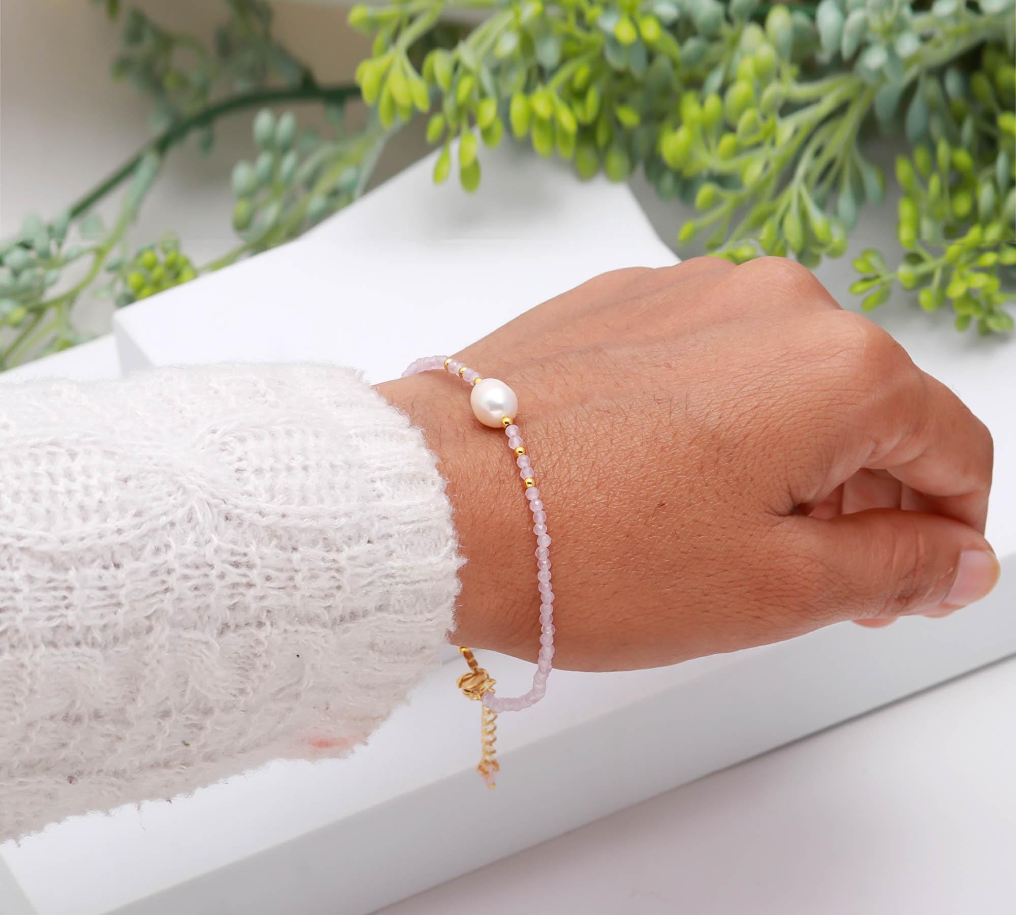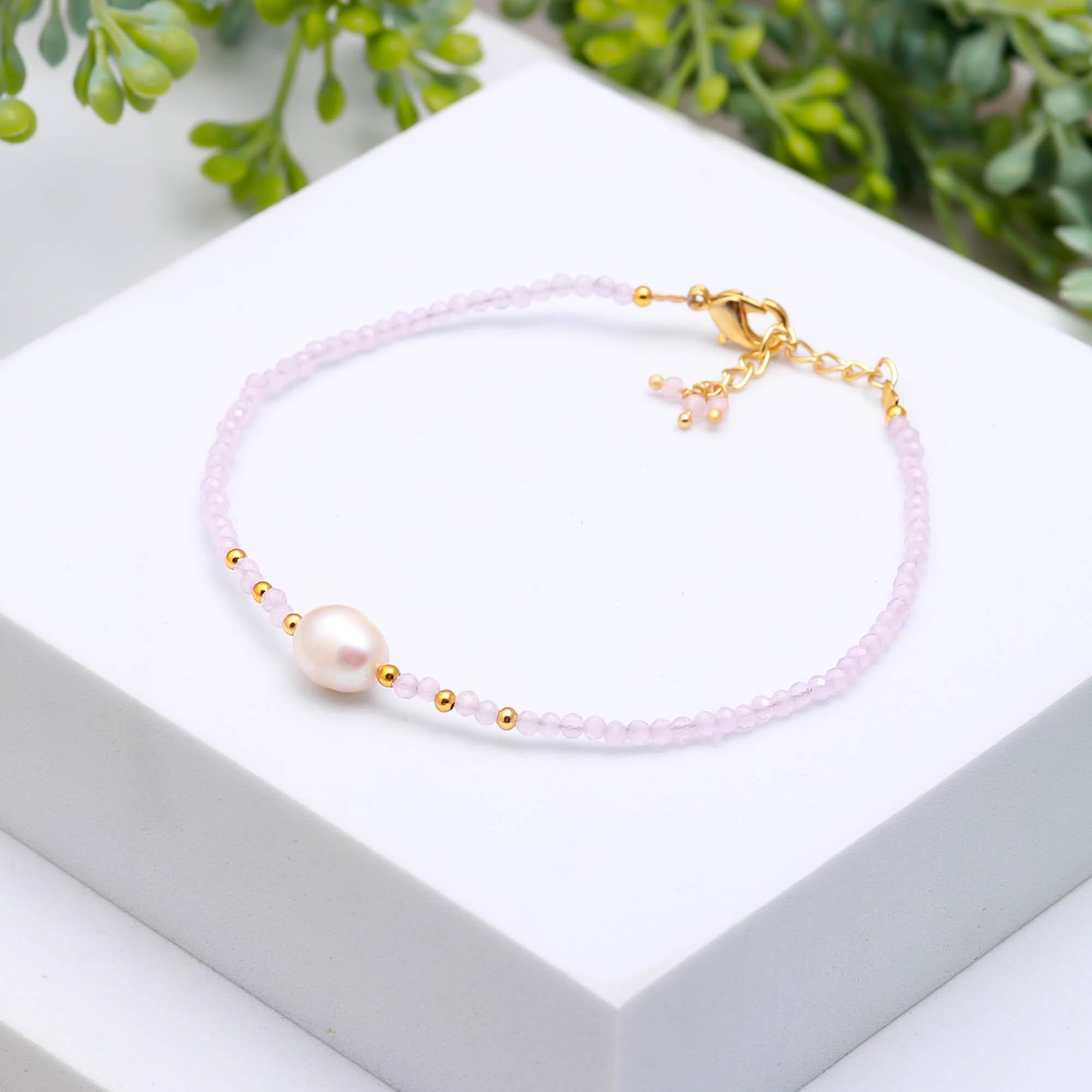 Gemstone size: 2.2–2.5 mm faceted rose quartz beads Accent size: 2 mm polished brass balls Centerpiece: Genuine freshwater pearl Metal: 18k gold plated brass Length: Adjustable 7 + 1 inch Technique: Hand-beaded, secure finishing