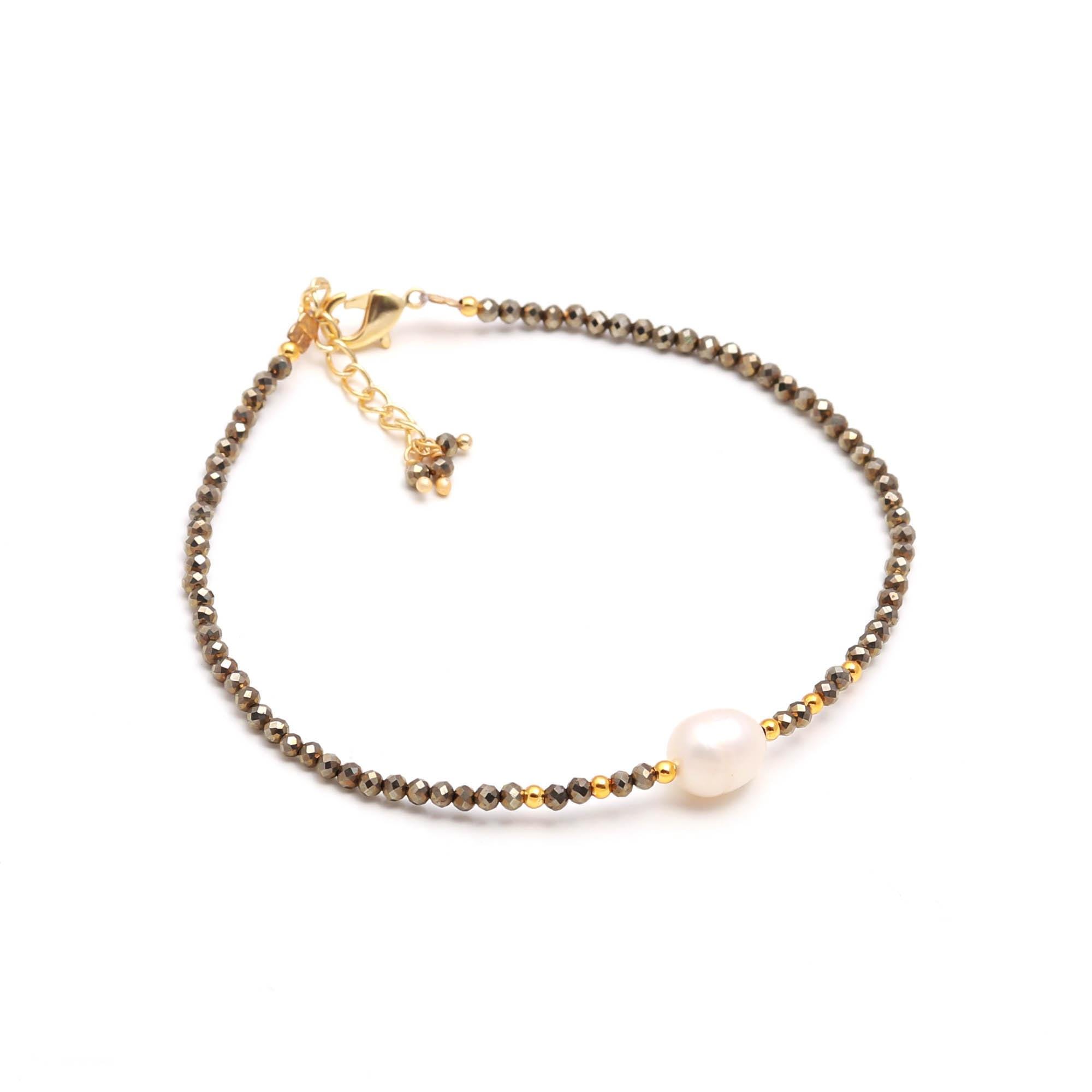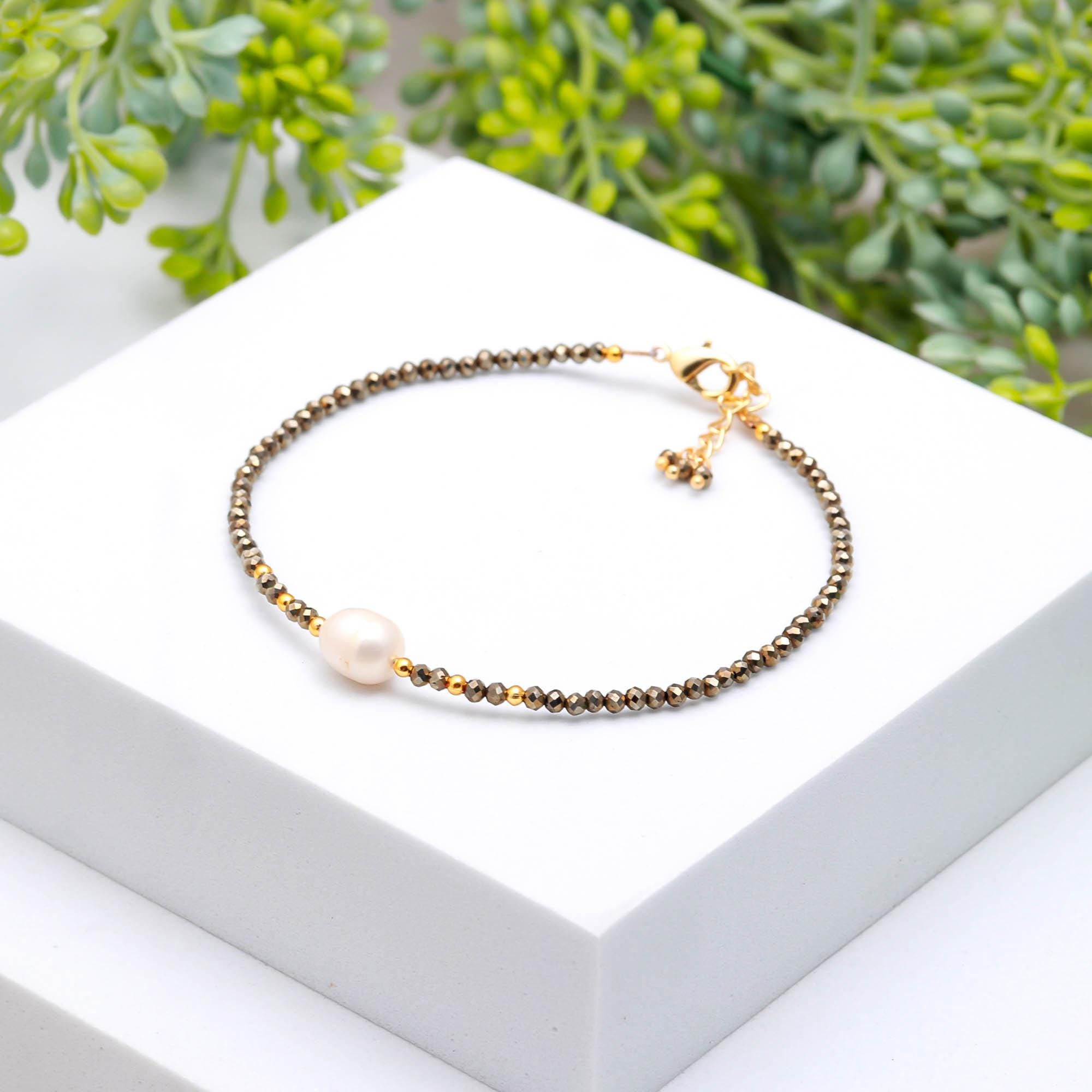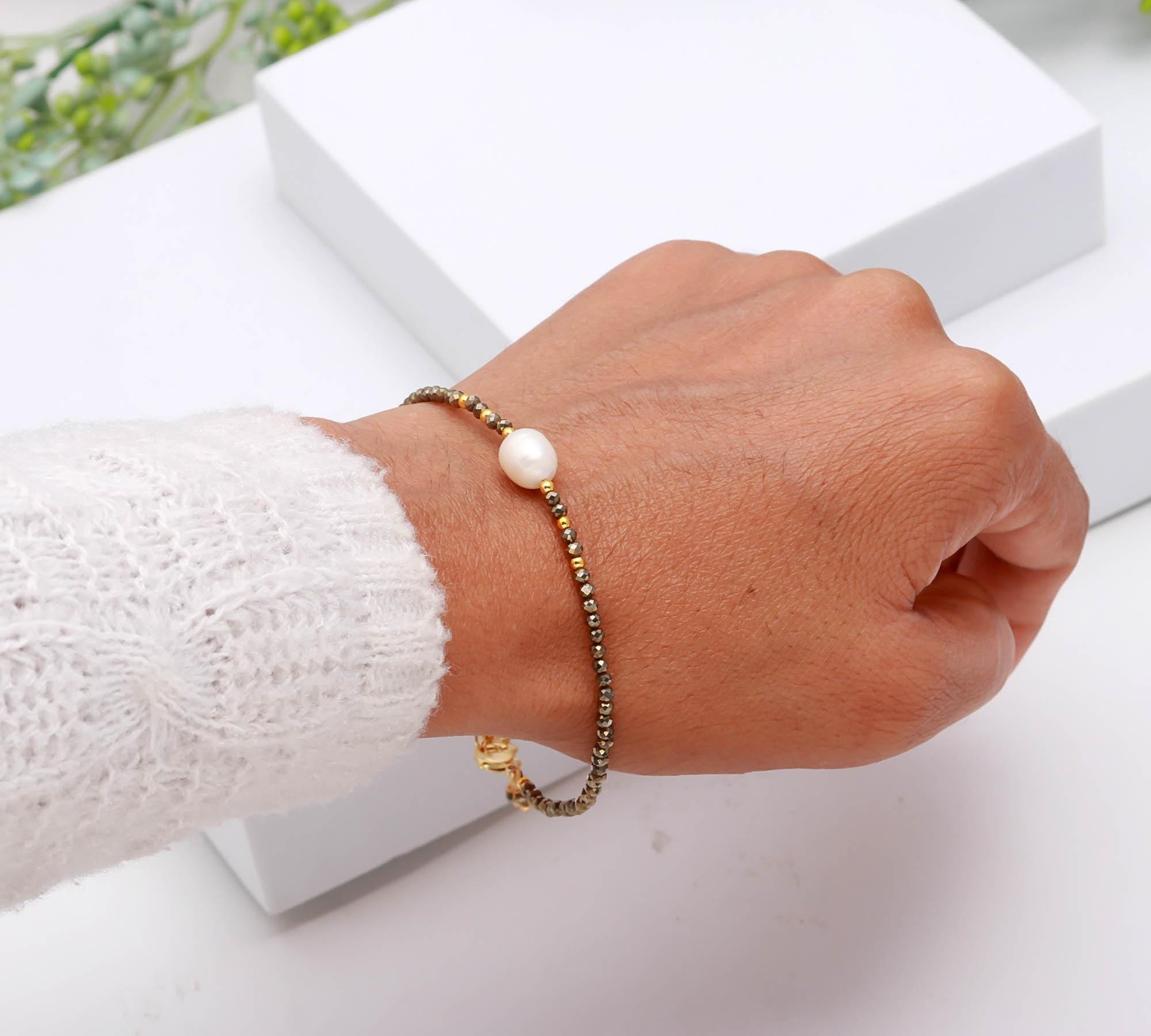 Gemstone size: 2.2–2.5 mm faceted pyrite beads Accent size: 2 mm polished brass balls Centerpiece: Genuine freshwater pearl Metal: 18k gold plated brass Length: Adjustable 7 + 1 inch Technique: Hand-beaded, secure finishing