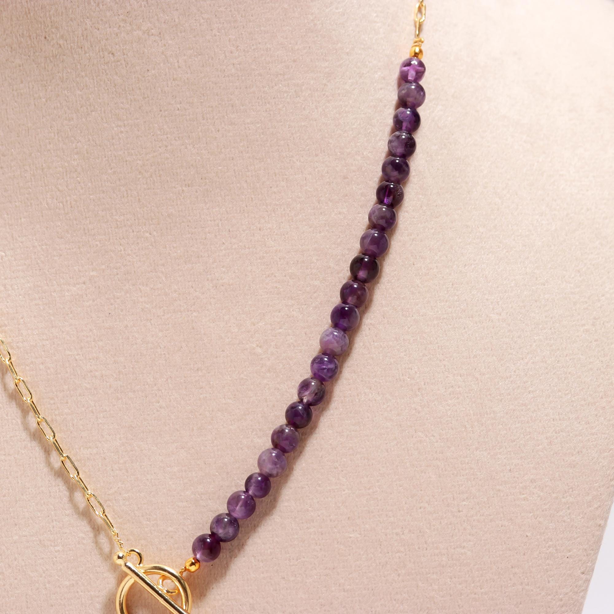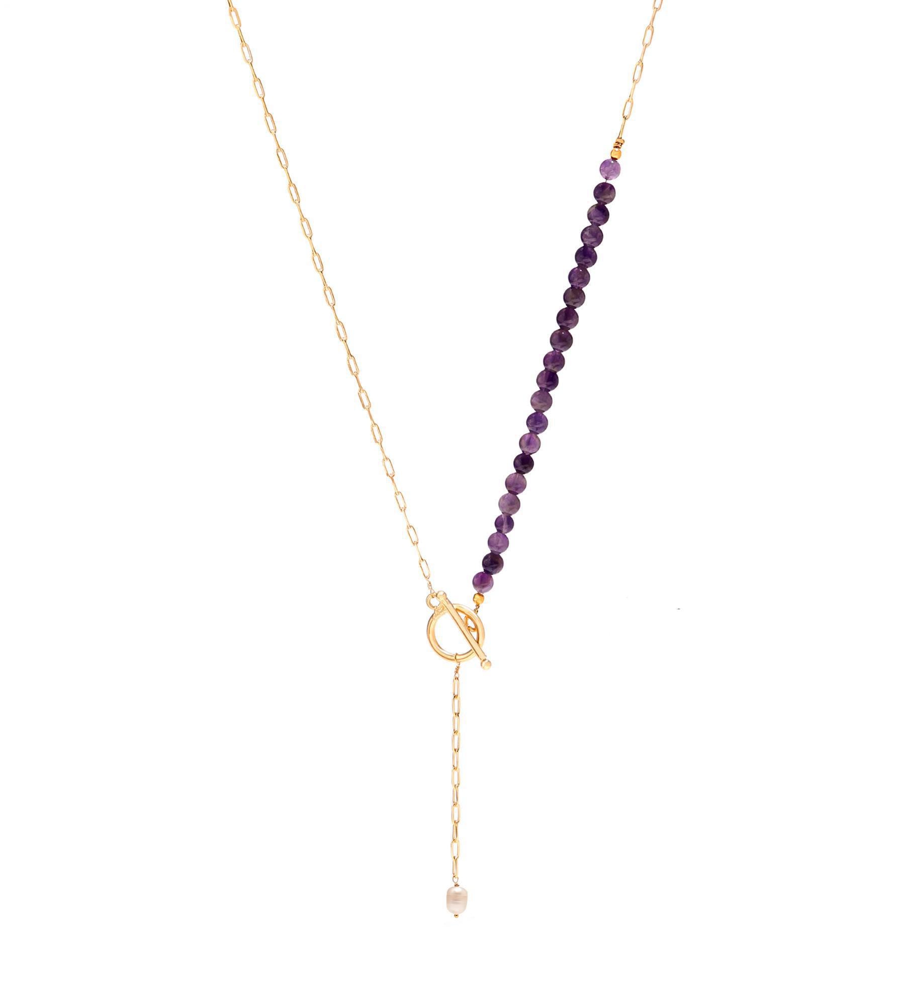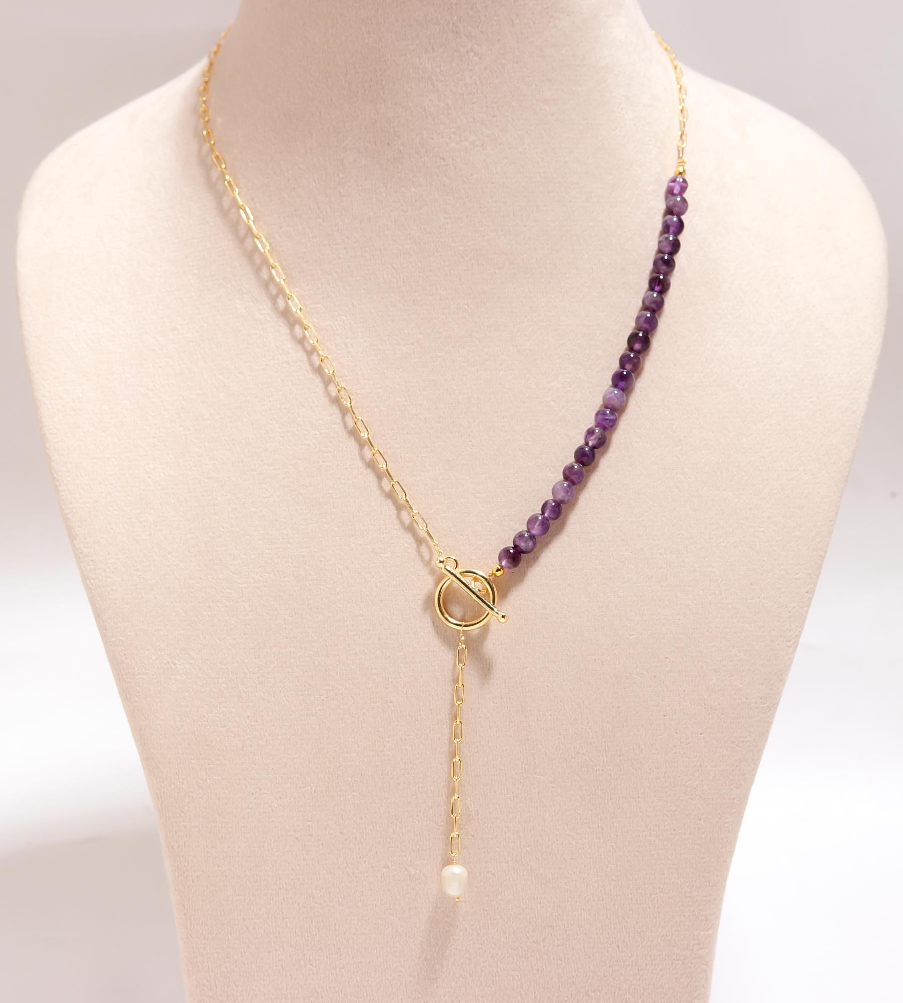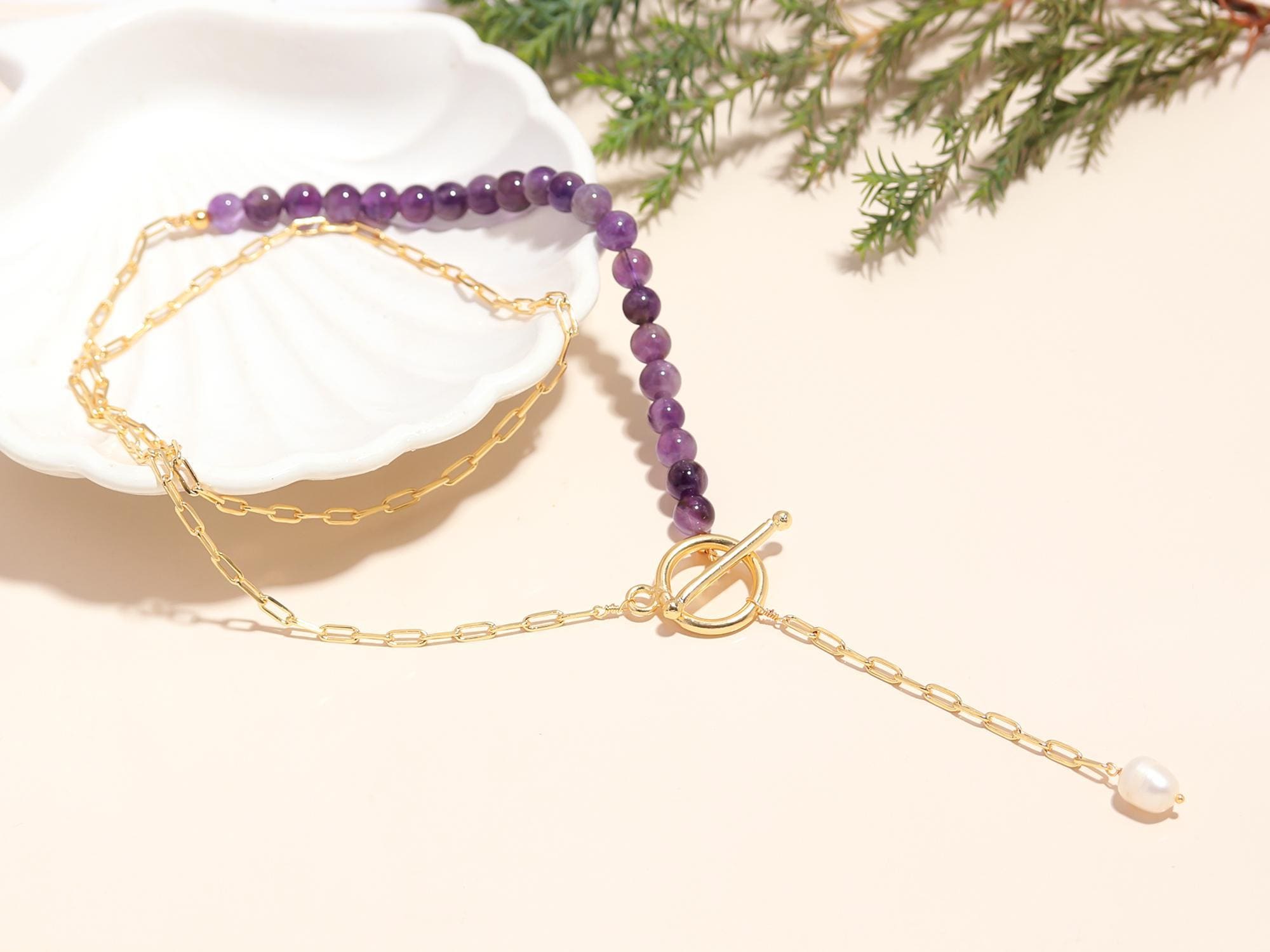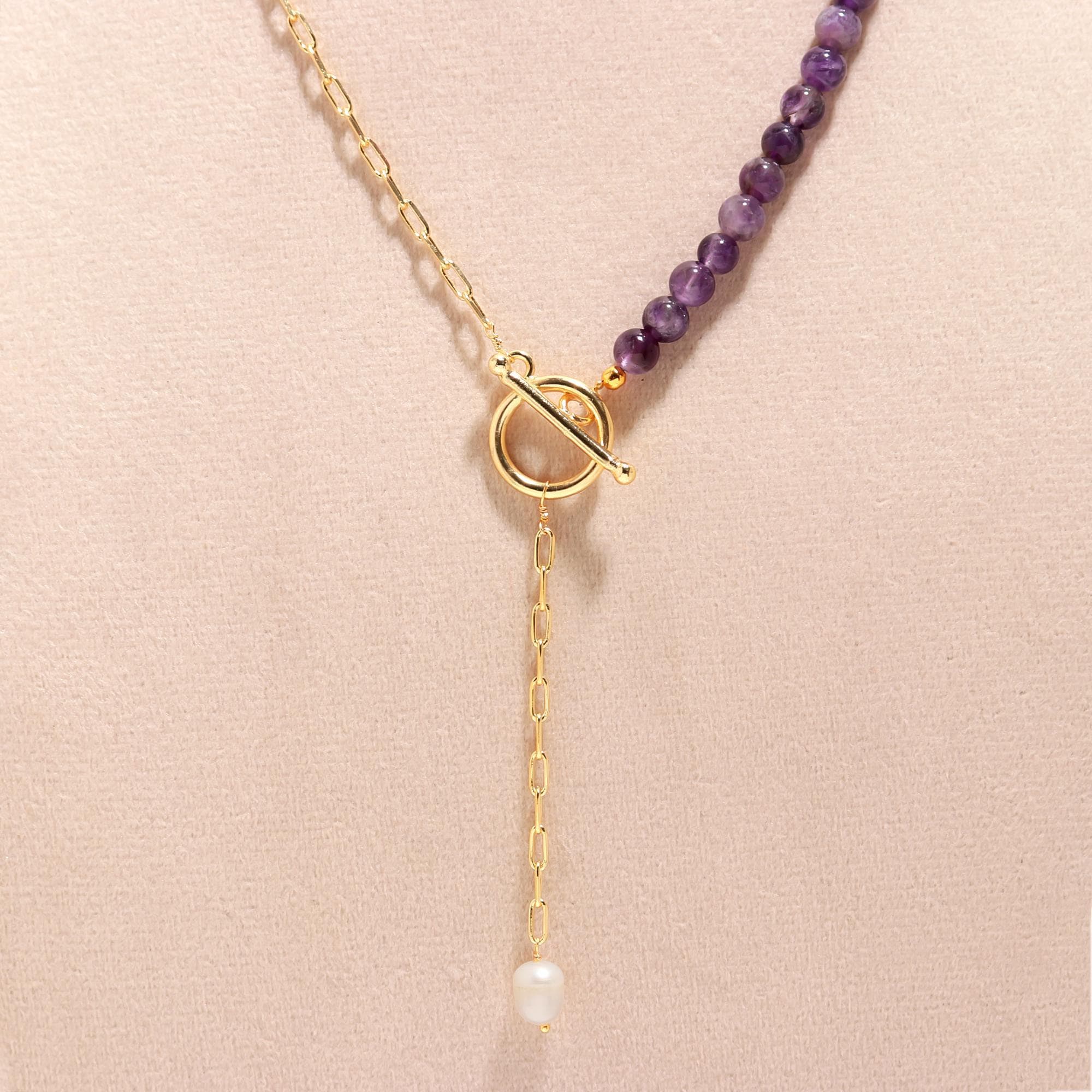 Elevate your collection with the mystical beauty of the Poshpendant Amethyst Asymmetrical Paper Clip Chain Necklace. One side features a vibrant 5-inch segment of natural 6 mm amethyst gemstone beads, contrasted by a sleek 16-inch paper clip chain plated in luxurious 18K gold. Completed with a stylish toggle lock, the necklace drops into a delicate chain with a luminous freshwater pearl accent, making a total length of 21 inches.