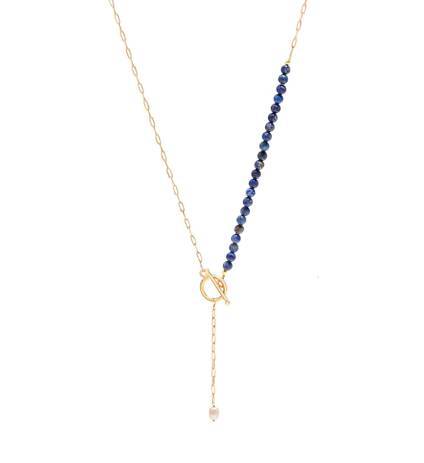 Radiate wisdom and deep blue beauty with the Poshpendant Lapis Lazuli Asymmetrical Paper Clip Chain Necklace. One side features a striking 5-inch segment of natural lapis lazuli beads (6 mm), while the other side is classic 16-inch 18K gold plated brass paper clip chain. A chic toggle lock finishes the necklace, with a graceful chain drop ending in a freshwater pearl accent. The overall length is 21 inches, showcasing artistry and crystal energy.