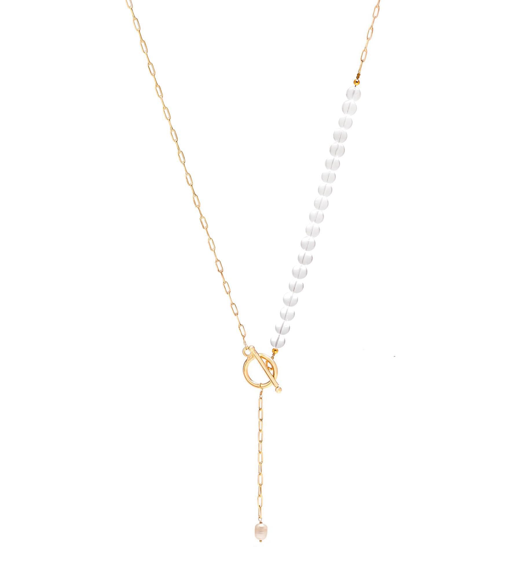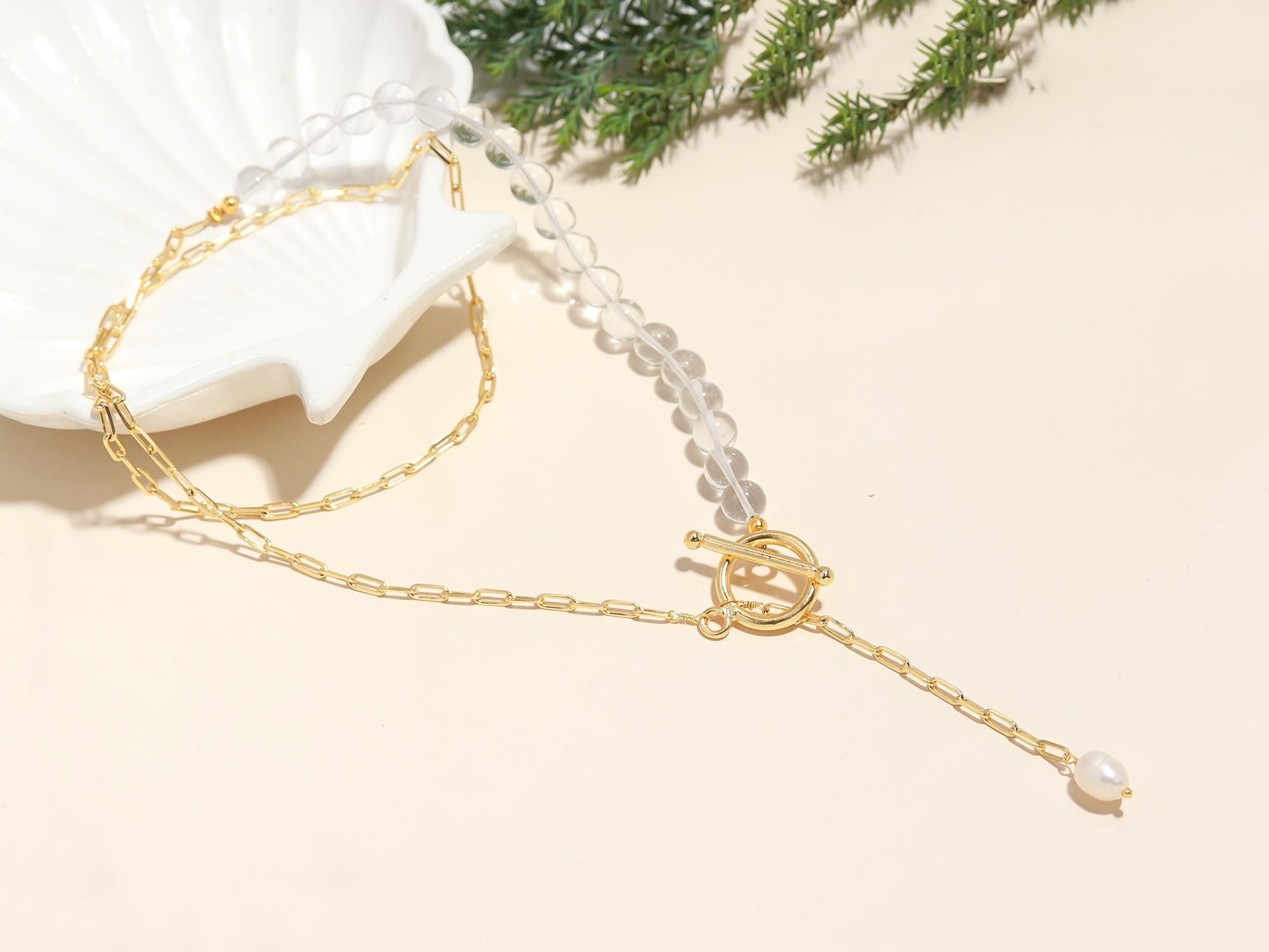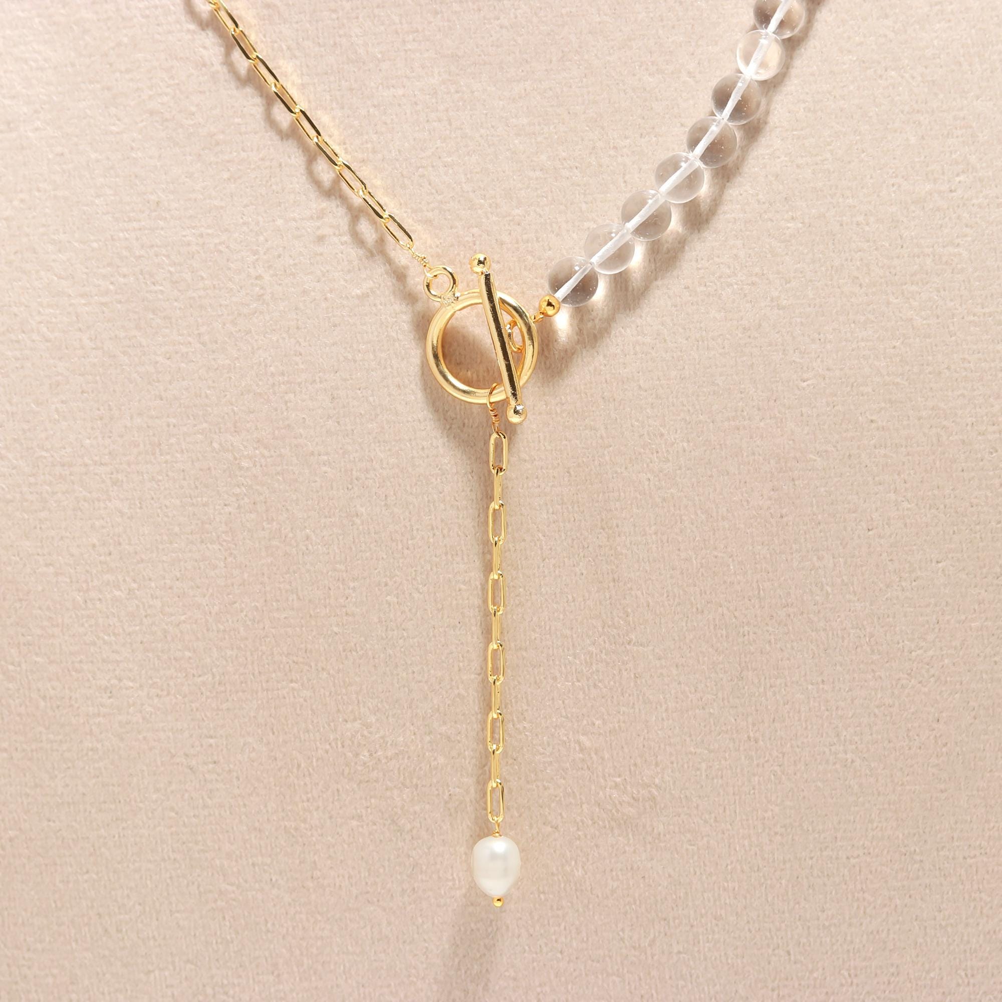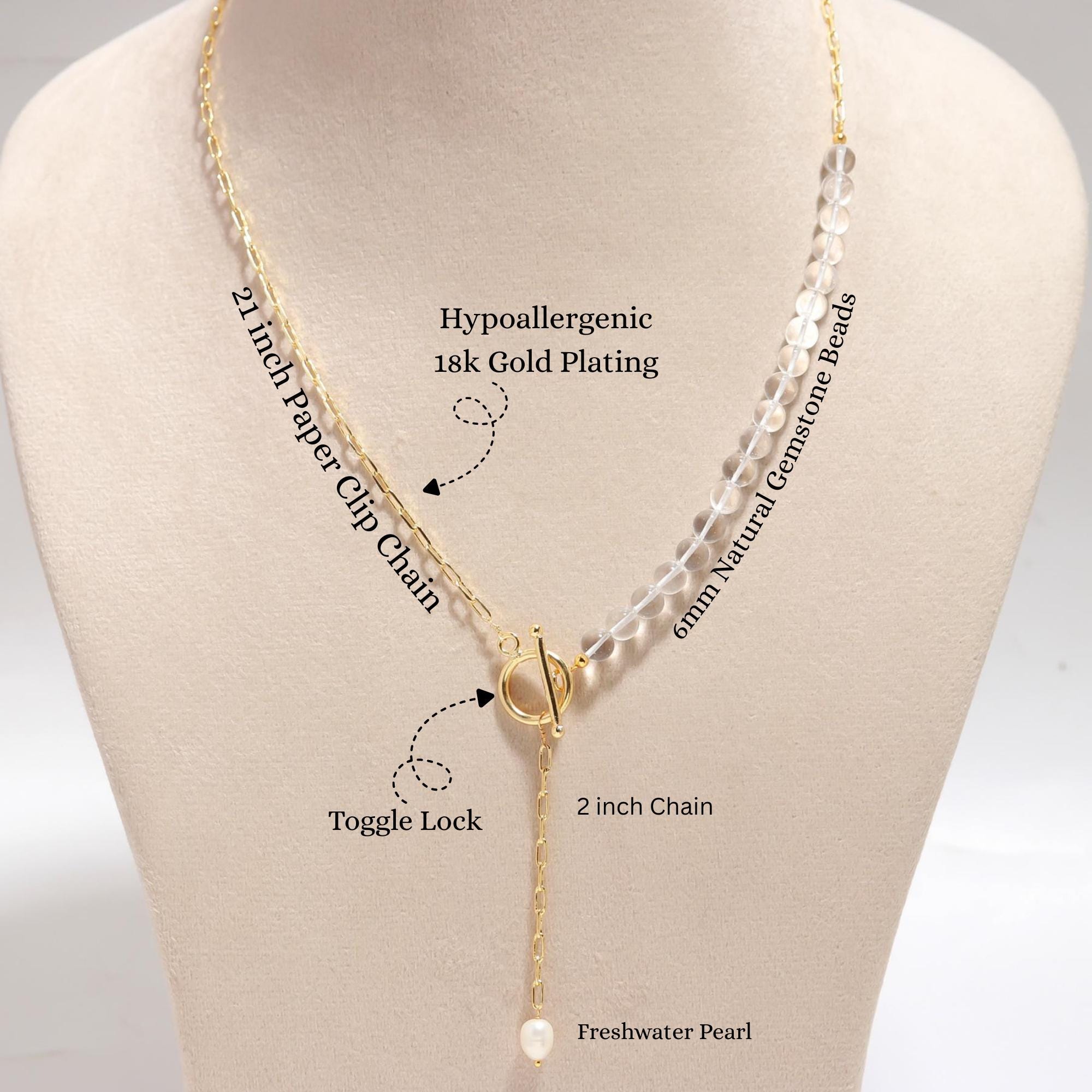 Illuminate every look with the Poshpendant Clear Quartz Asymmetrical Paper Clip Chain Necklace. One side boasts a 5-inch segment of natural clear quartz beads (6 mm), brilliantly complemented by a classic 16-inch 18K gold plated brass paper clip chain. The necklace closes with a contemporary toggle lock, followed by a drop chain ending in a luminous freshwater pearl. The total length is 21 inches, uniting clarity and modern style.