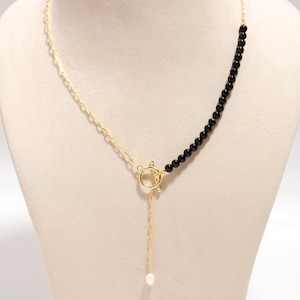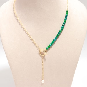 Design: Asymmetrical: one side gemstone beads (5 inch), one side chain (16 inch)