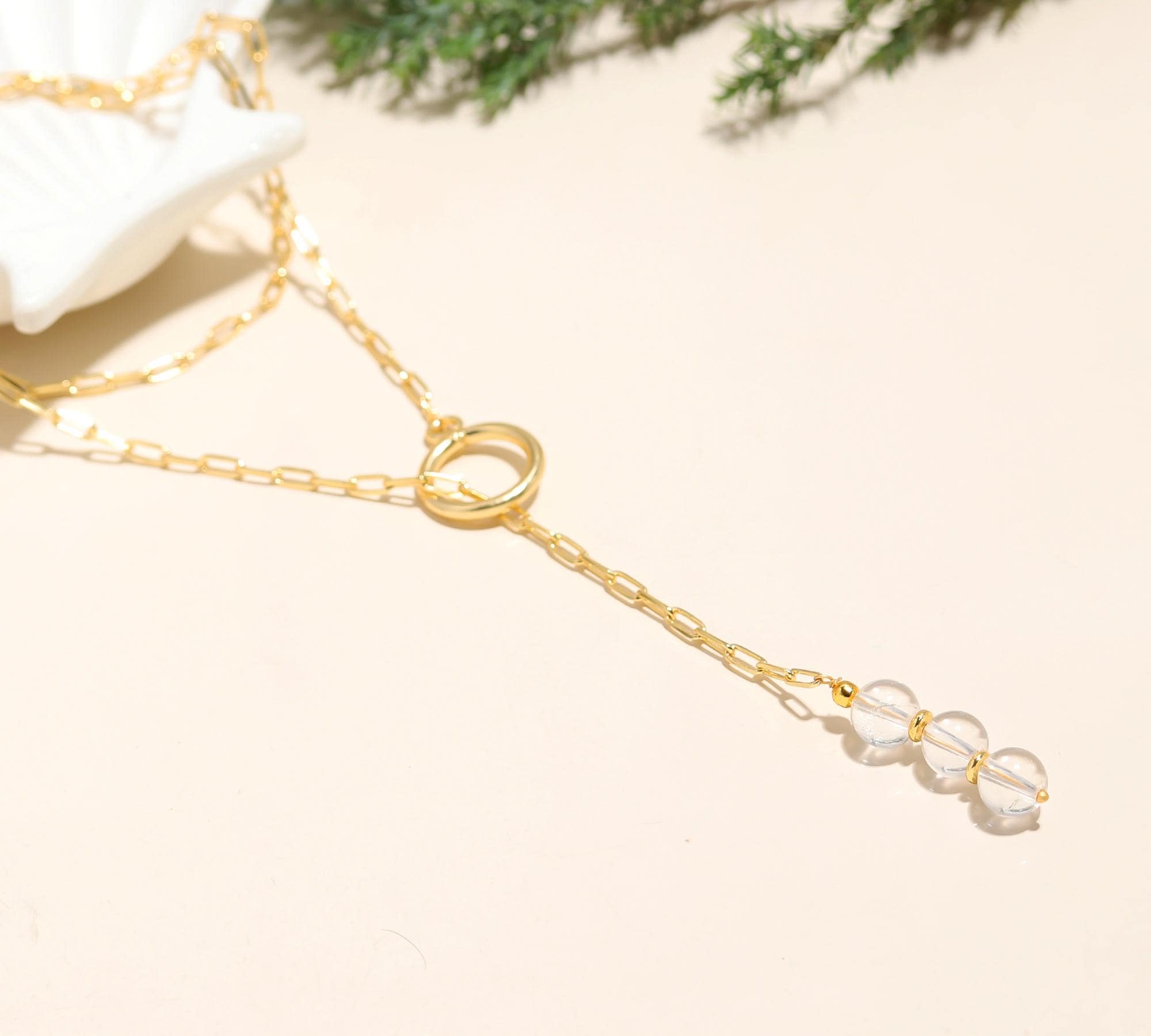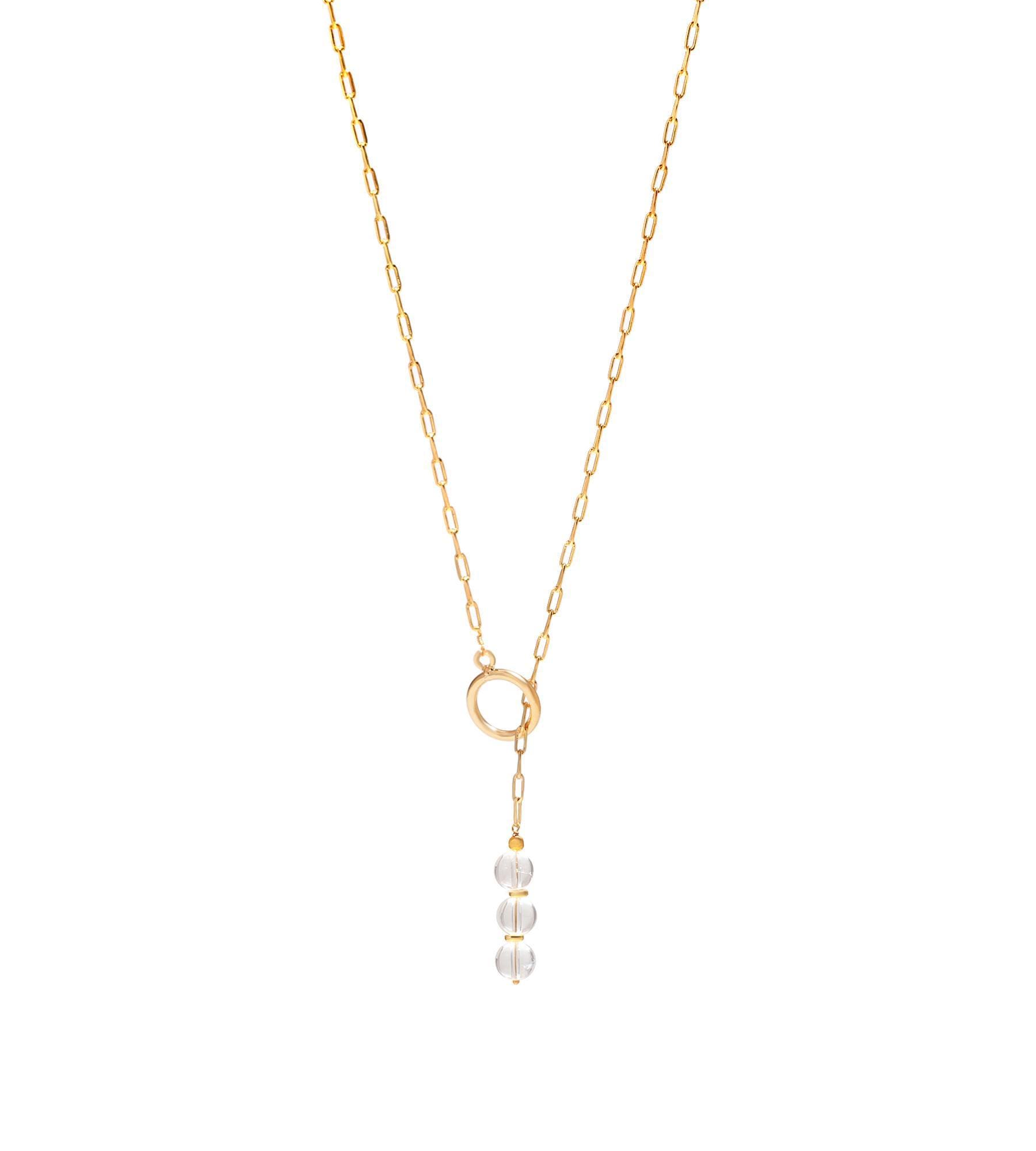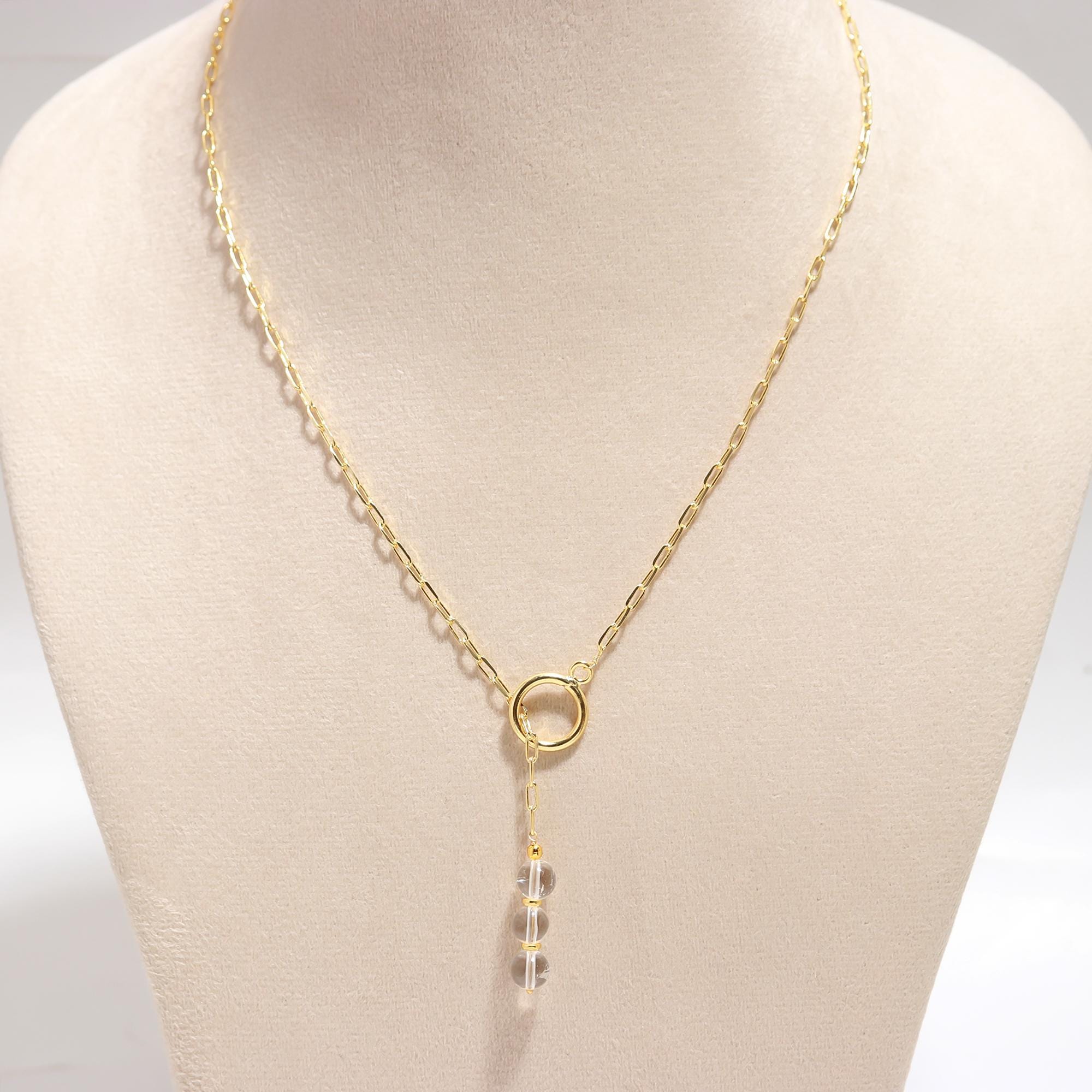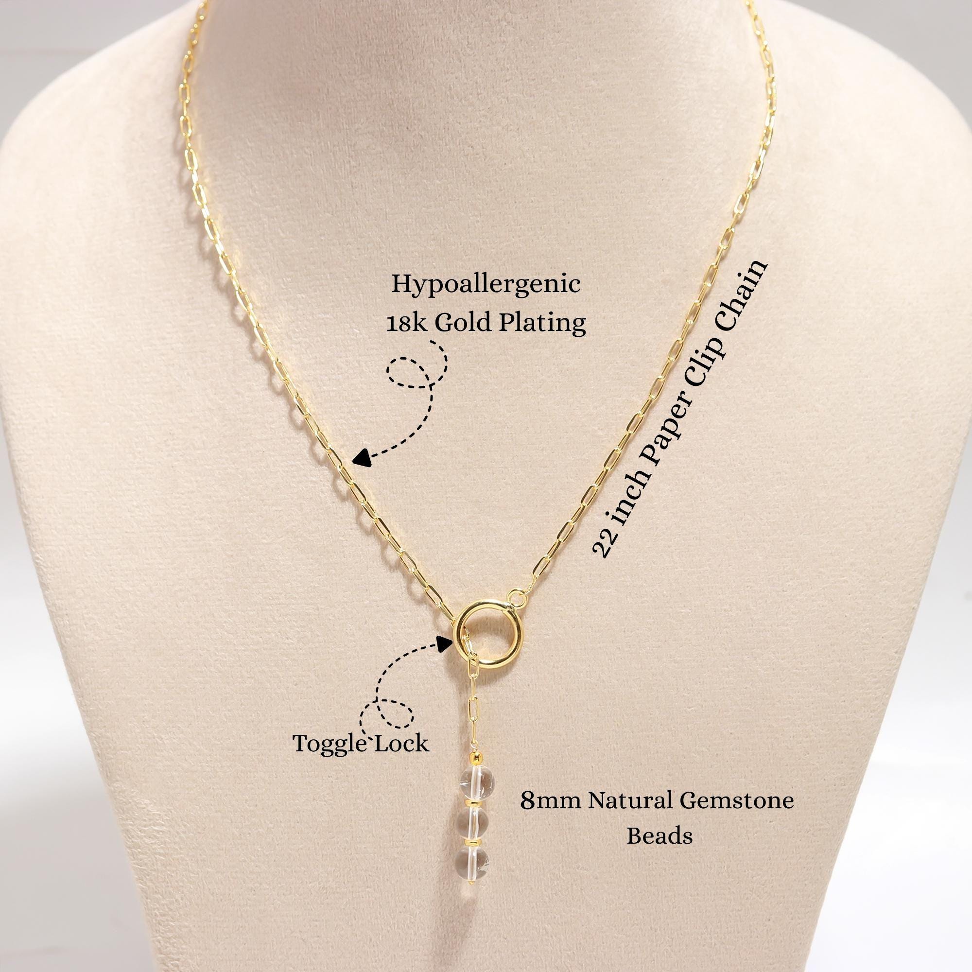Elevate your look with the Poshpendant Clear Quartz Paper Clip Chain Necklace. This modern design features an 18K gold plated brass paper clip chain with a secure toggle lock at the center, where three natural 8 mm clear quartz beads create a radiant vertical drop. The necklace measures 22 inches in length—perfect for layering or as a solo statement.