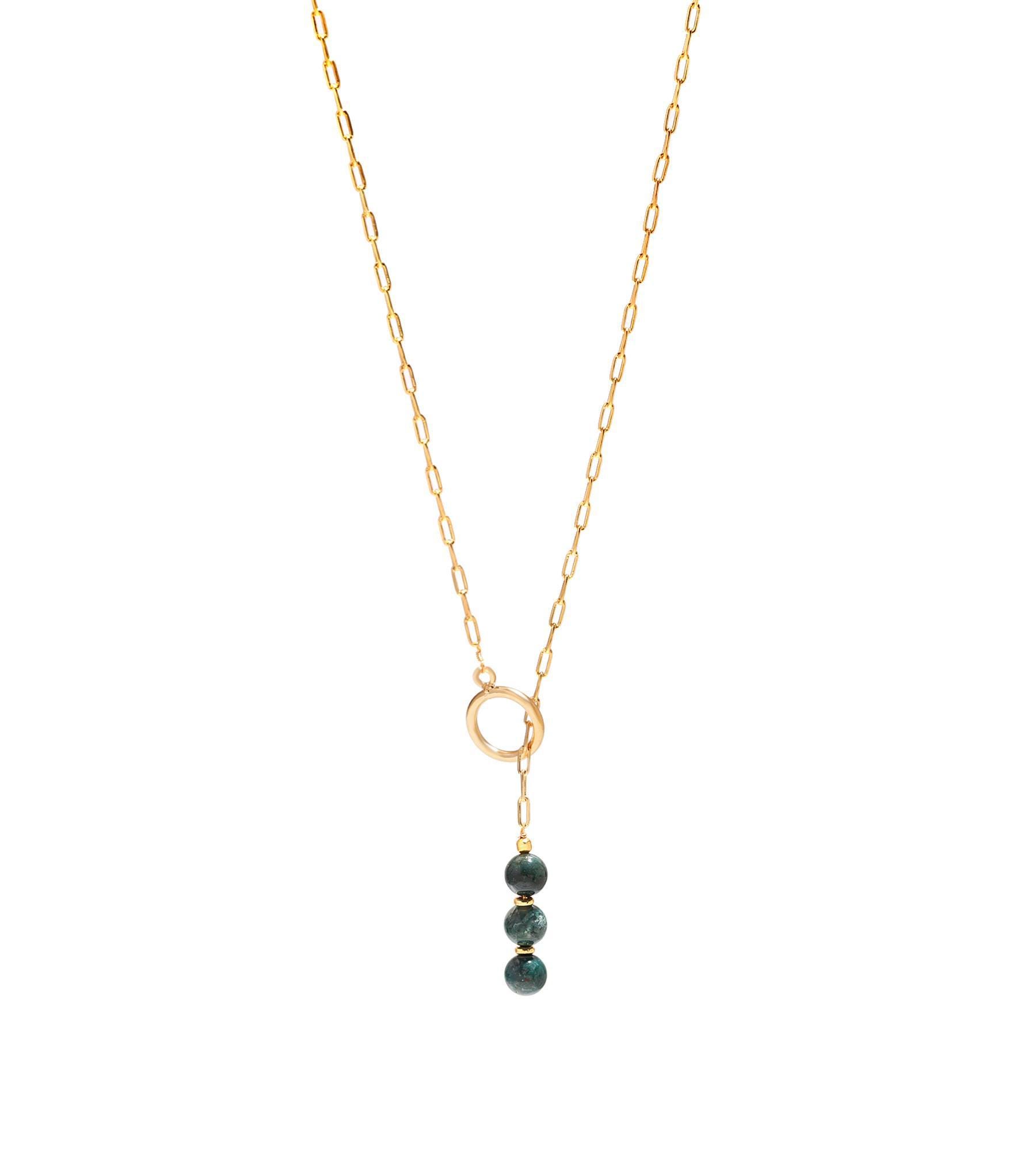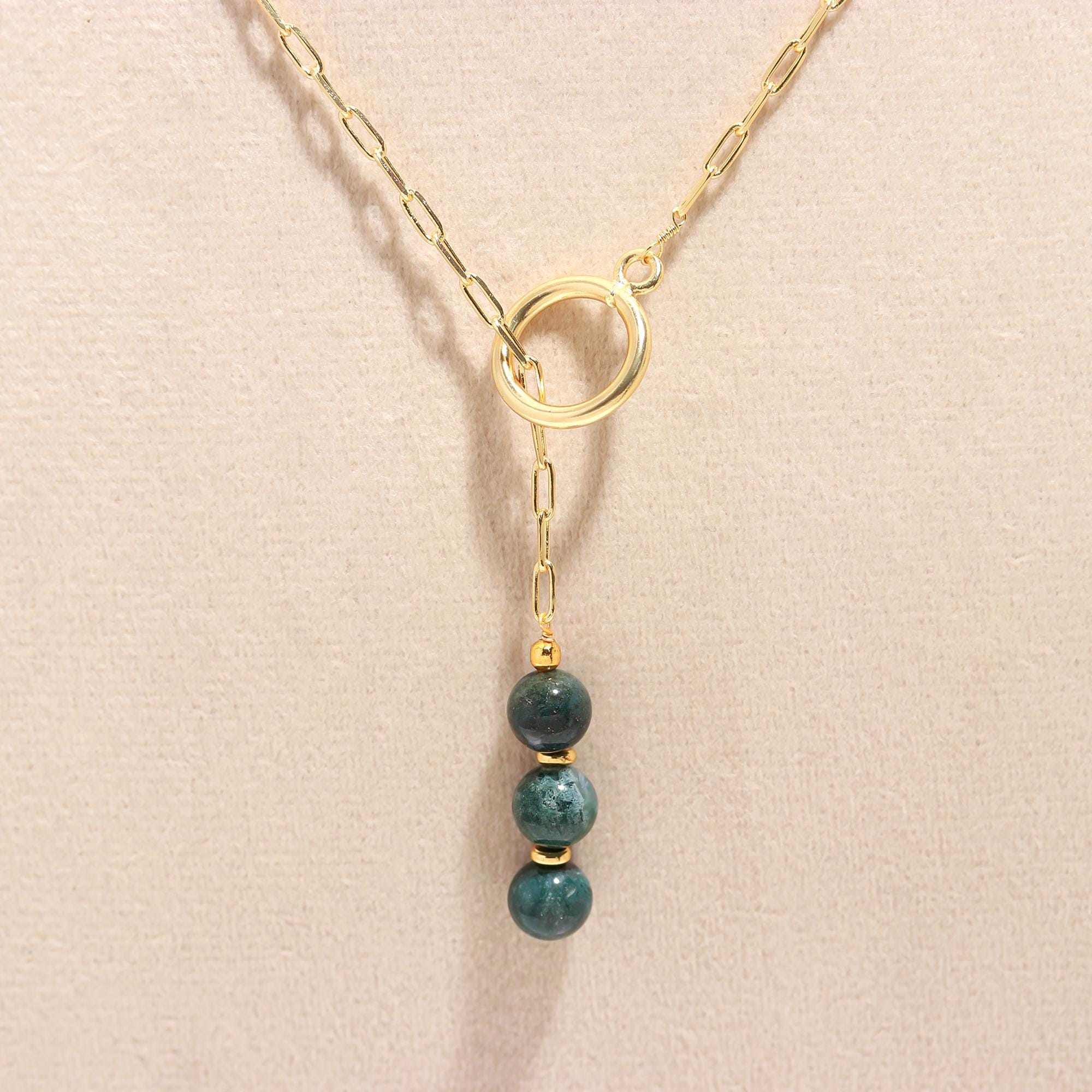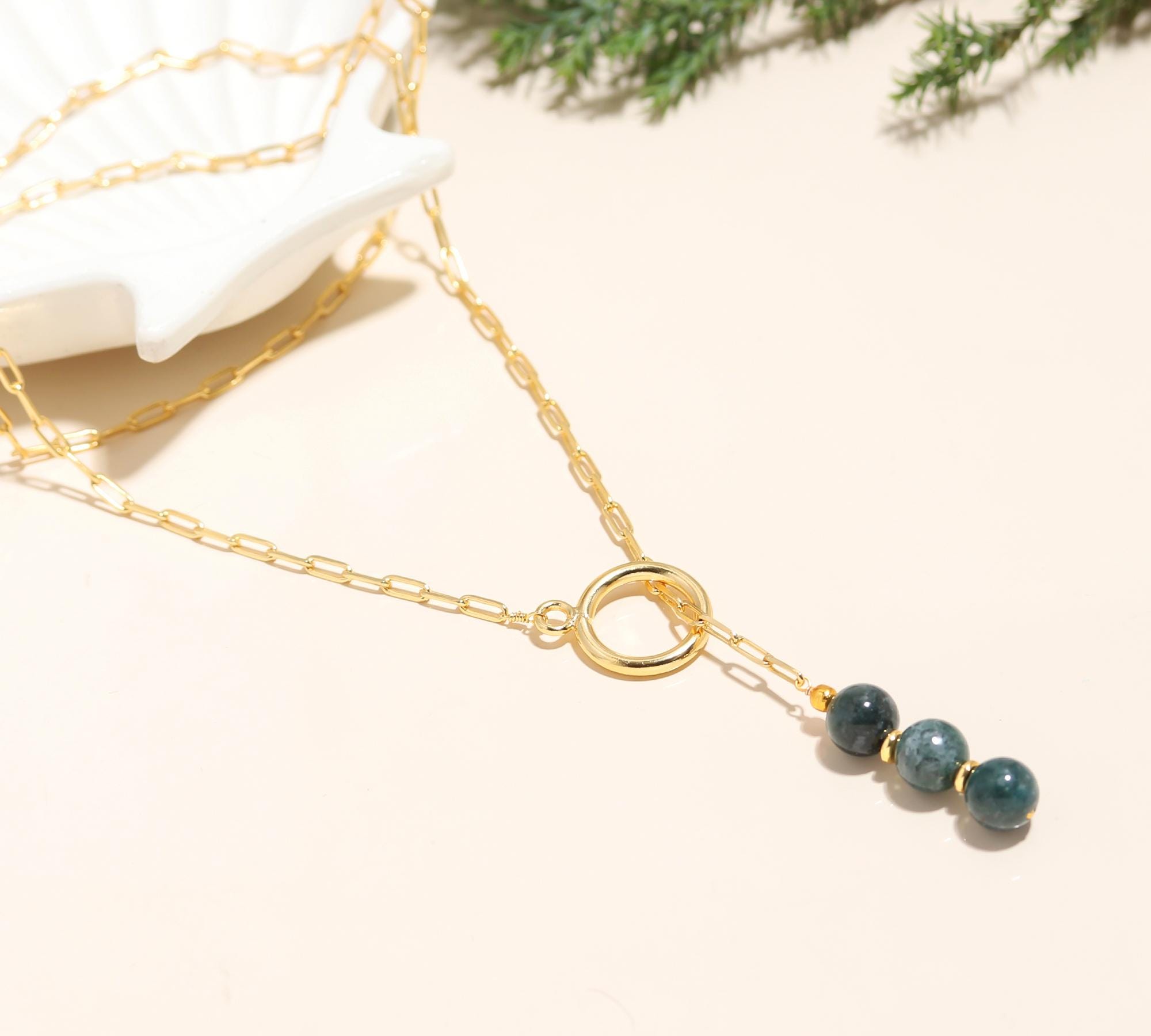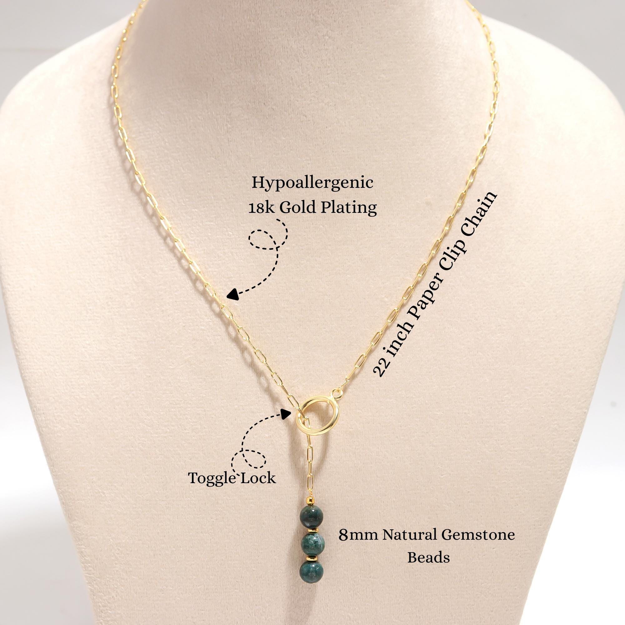 Immerse in earthy elegance with the Poshpendant Moss Agate Paper Clip Chain Necklace. This contemporary handmade necklace features an 18K gold plated brass paper clip chain, centered by a modern toggle lock. The focal point is a drop accent set with three natural 8 mm moss agate beads, each displaying unique, forest-like green inclusions. The overall length is 22 inches, making this an ideal piece for layering or wearing solo.