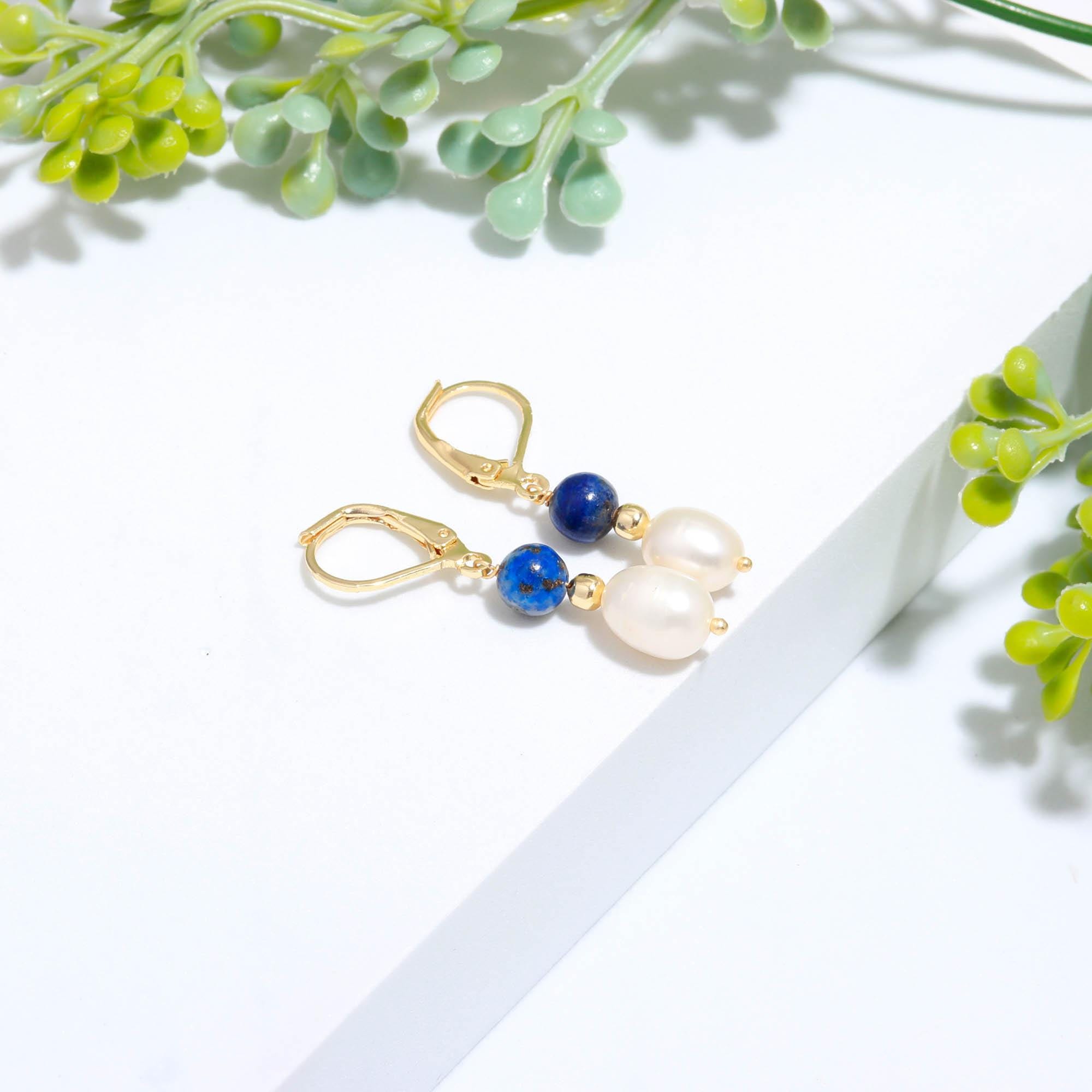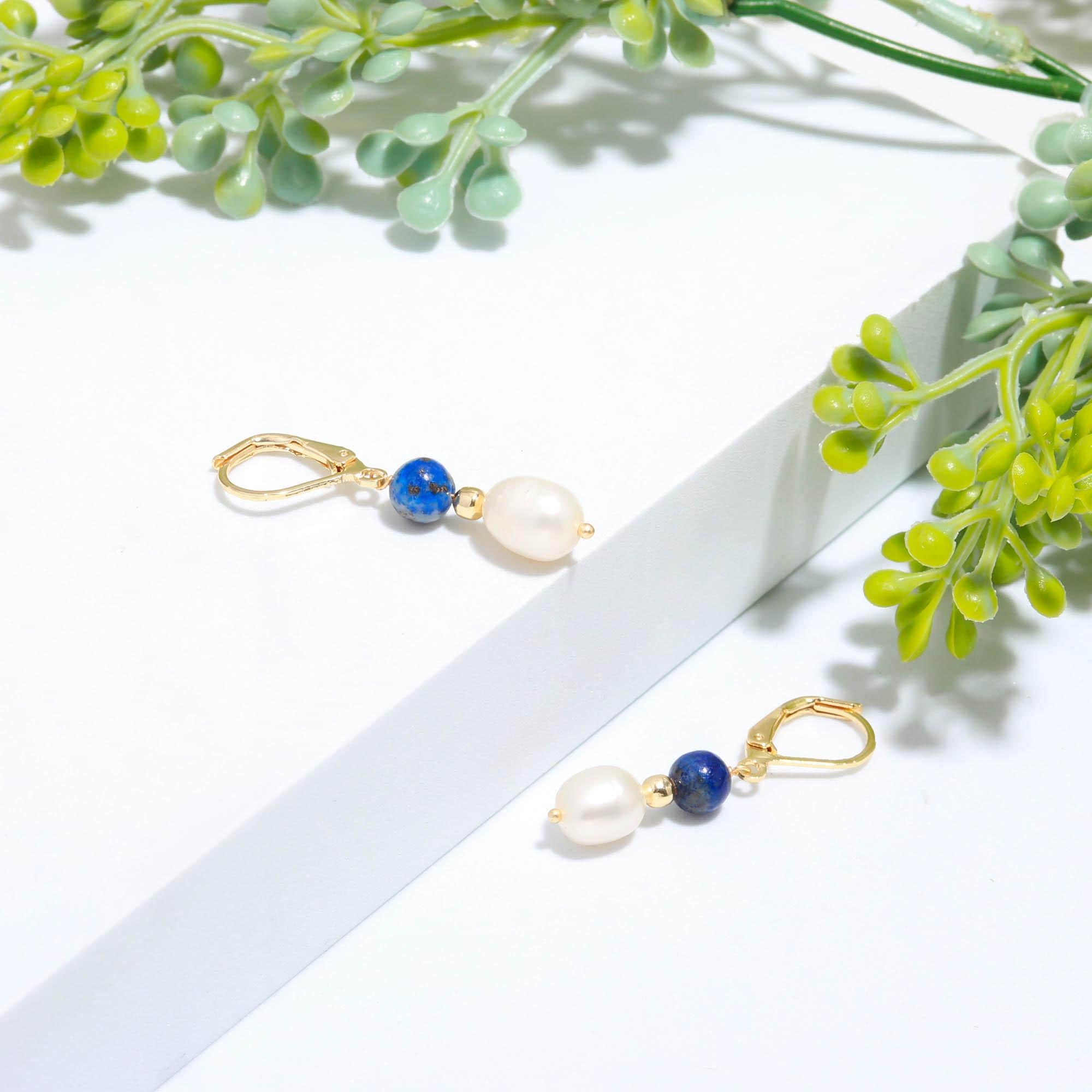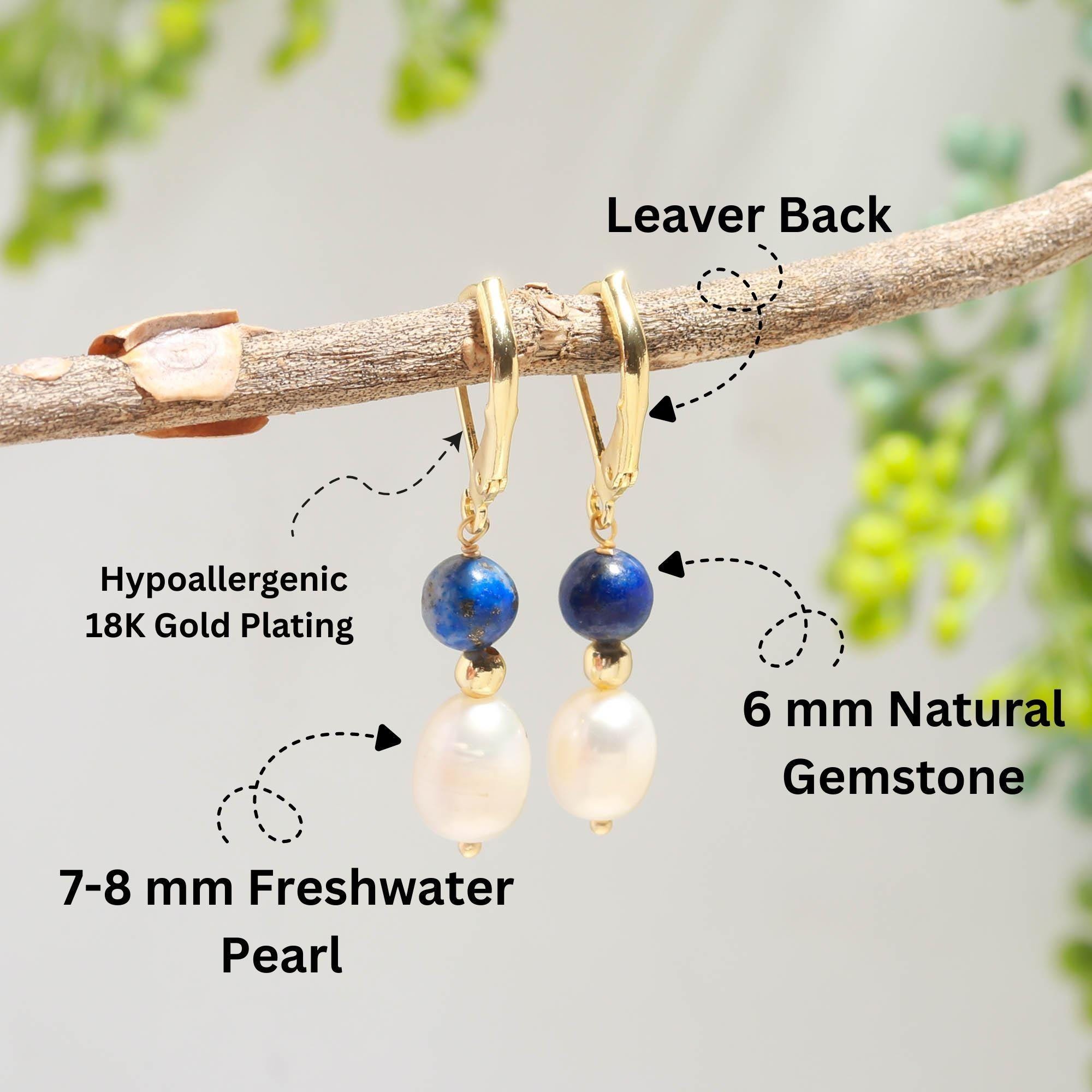 Add a touch of regal blue to your style with the Poshpendant Lapis Lazuli & Freshwater Pearl Drop Earrings. These handmade earrings pair a 6 mm natural lapis lazuli bead with a 7–8 mm genuine freshwater pearl, suspended from hypoallergenic 18K gold plated brass settings. The secure leaver back fitting ensures comfortable wear for sensitive ears and provides graceful movement.