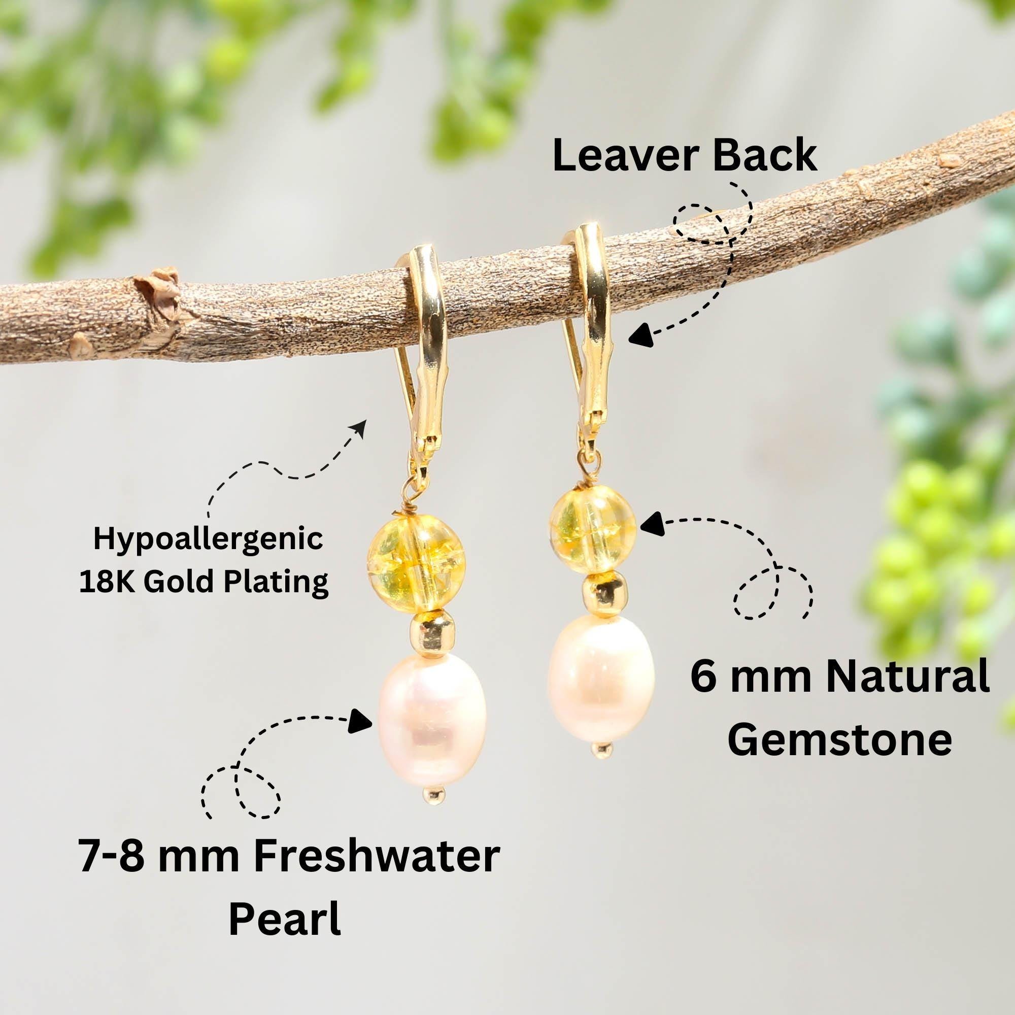 Bring a touch of golden radiance to your style with the Poshpendant Citrine & Freshwater Pearl Drop Earrings. These earrings feature a sunny 6 mm natural citrine gemstone and a luminous 7–8 mm freshwater pearl, set in hypoallergenic 18K gold plated brass and suspended from secure leaver backs for maximum comfort and movement.