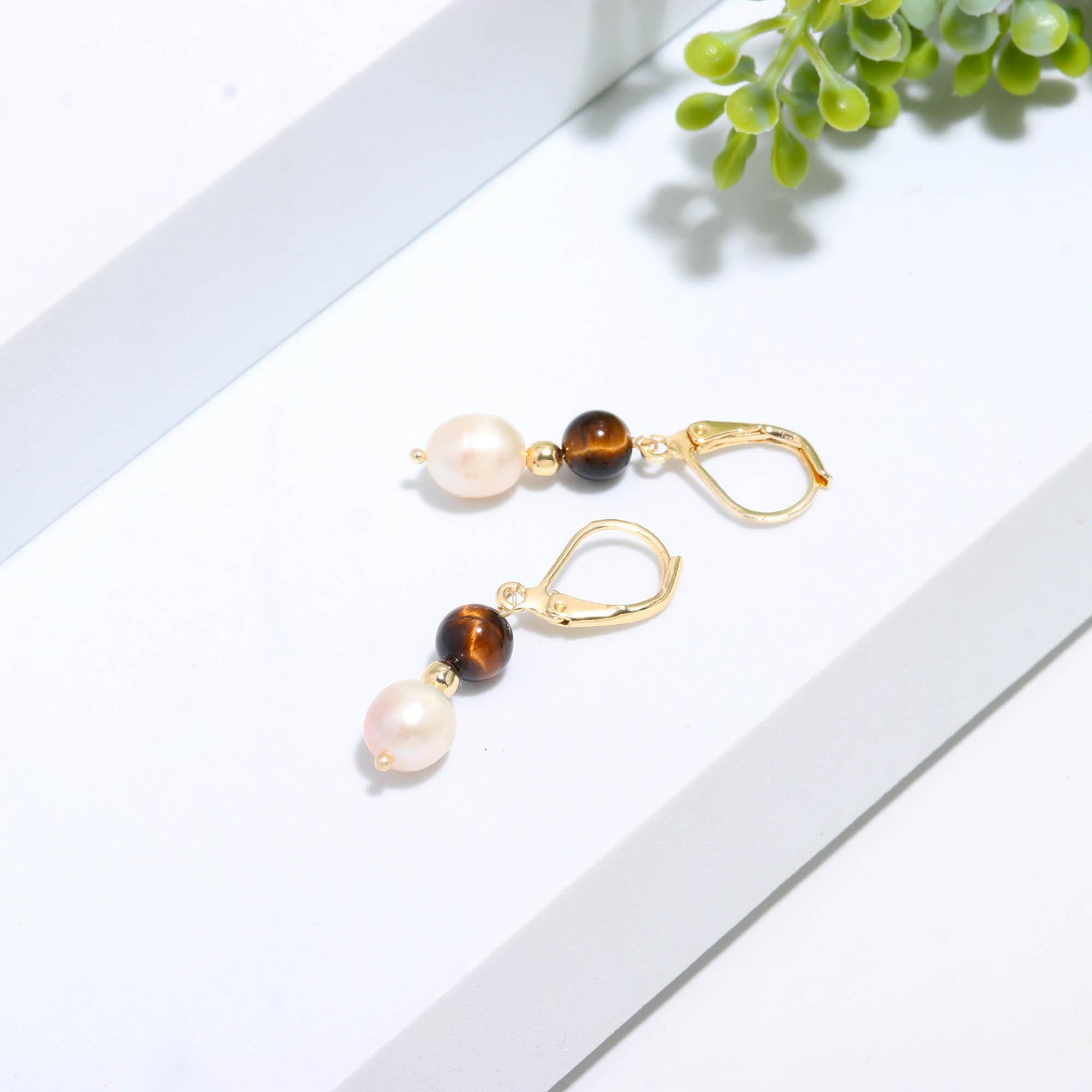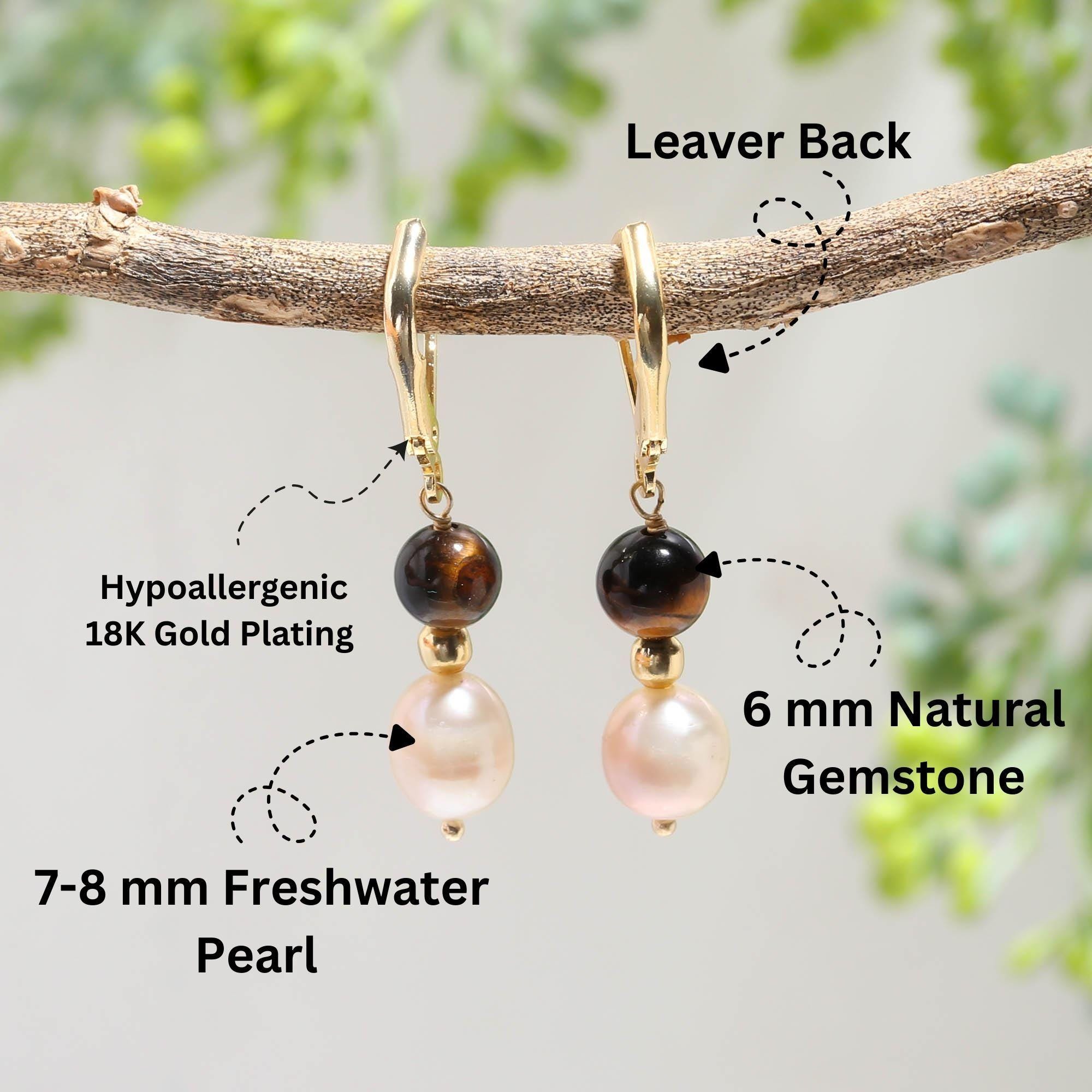 Empower your everyday style with the Poshpendant Tiger Eye & Freshwater Pearl Drop Earrings. Each earring features a golden-brown 6 mm natural tiger eye bead paired with a luminous 7–8 mm freshwater pearl, elegantly set in hypoallergenic 18K gold plated brass. The leaver back fittings offer secure, comfortable wear—perfect for sensitive ears and elegant movement.