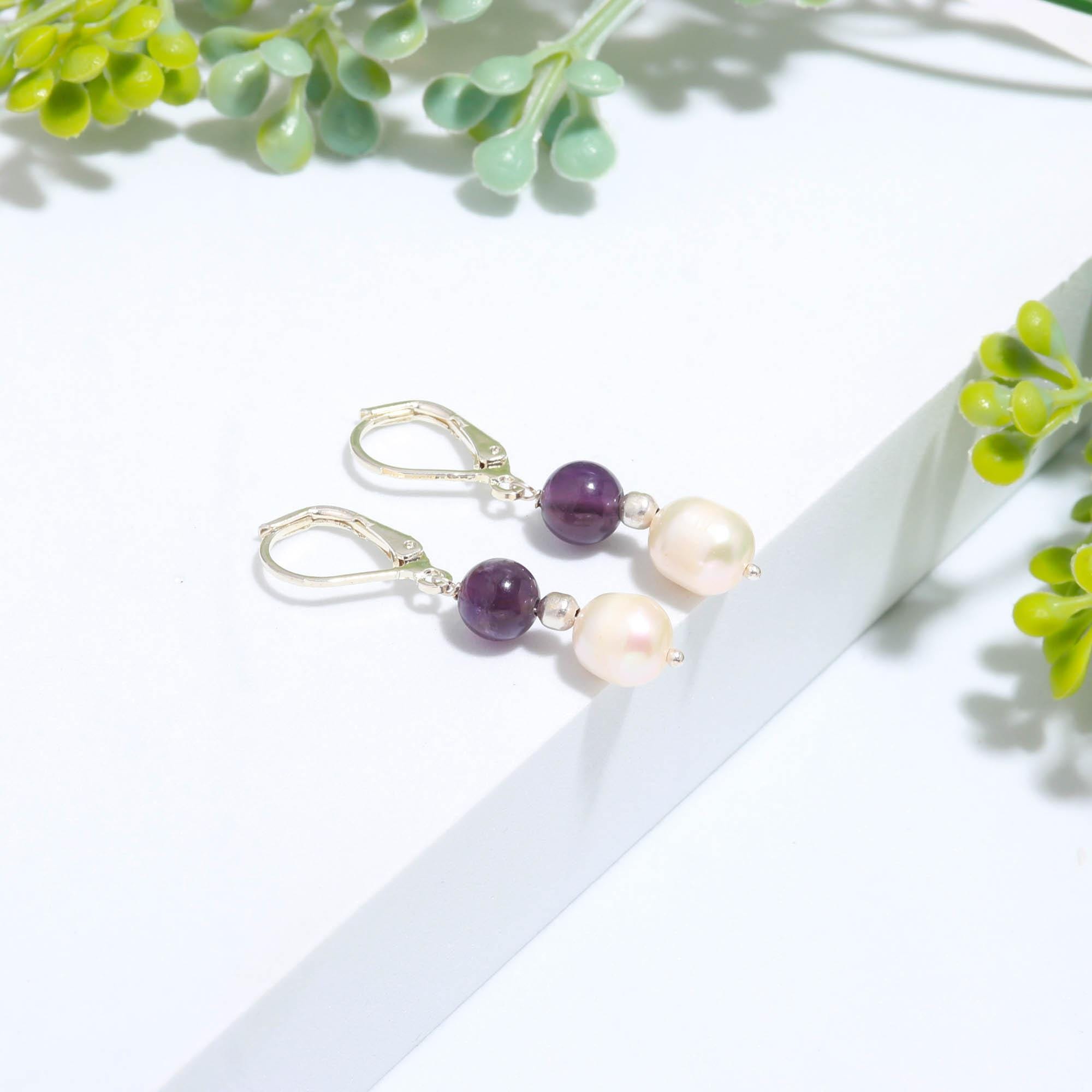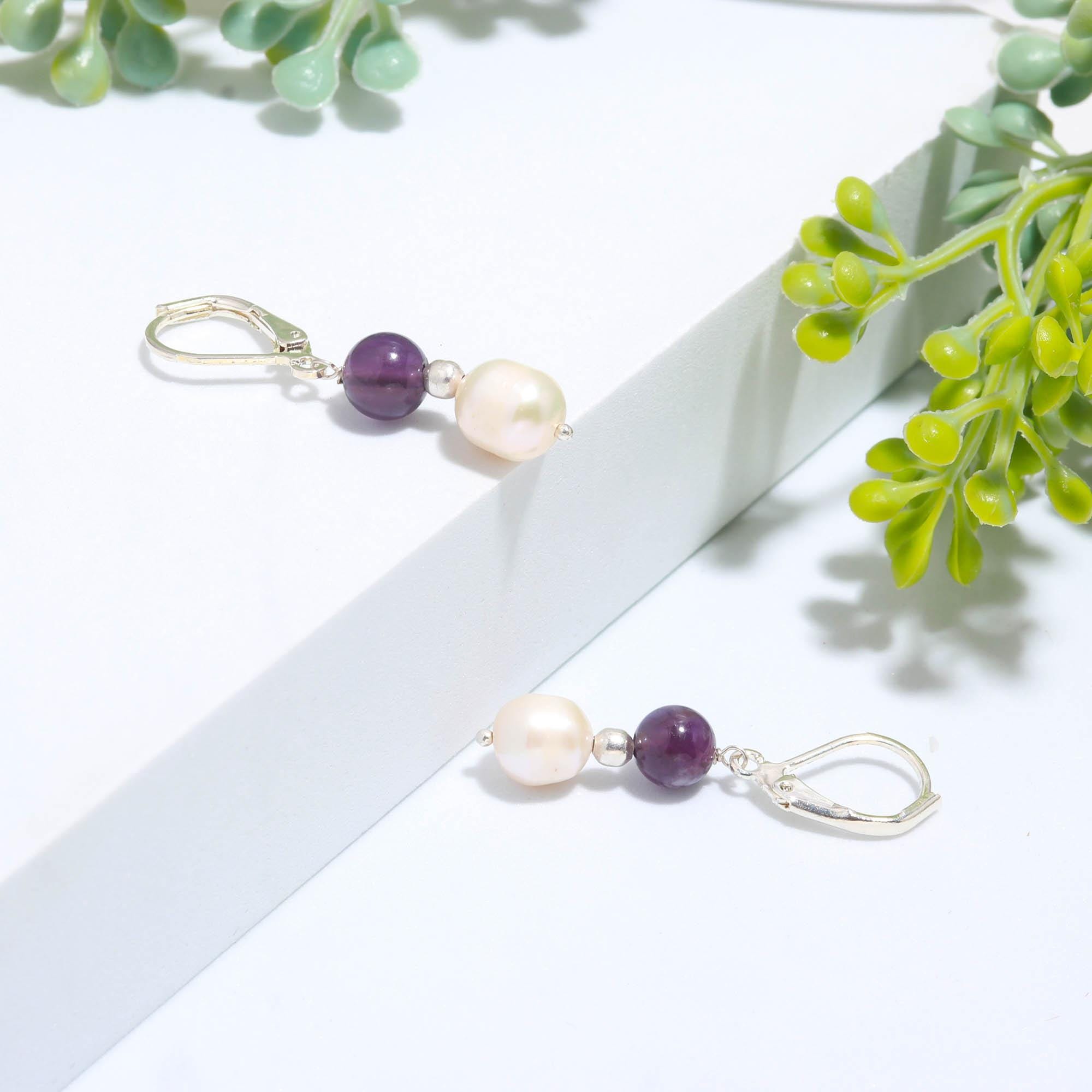 Add a luminous touch to your style with the Poshpendant Amethyst & Freshwater Pearl Drop Earrings, now in a stunning silver polish finish. Each earring features a rich purple 6 mm natural amethyst bead paired with a radiant 7–8 mm freshwater pearl, both set in silver-polished metal for a refined, contemporary look. The leaver back closure ensures lasting comfort and elegant movement.